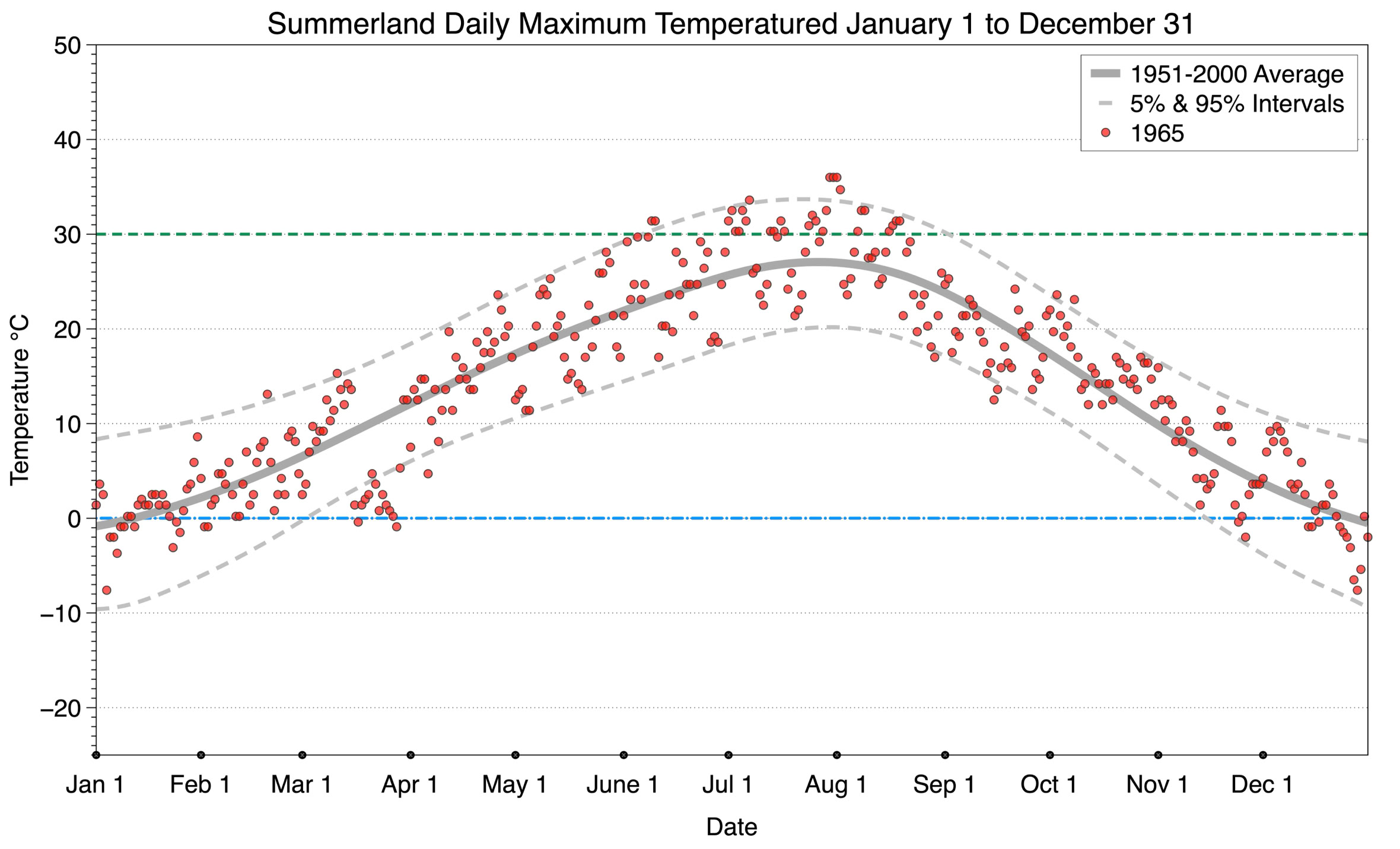 The graph below displays the day-to-day values of maximum daily temperature (red dots) at Summerland for the year 1965. On this graph, the dark grey thick center line is the average daily temperature calculated from 50 years of data from 1951 to 2000. The dotted light grey lines are the 5% and 95% probability intervals - about 90% of the data from 1951 to 2000 fell within these boundaries. Daily temperatures can be considered as extreme cold or extreme hot events if they that fall outside the 5% or 95% probability intervals, respectively. In Canada, temperatures above 30°C (green dotted line) are considered extreme daily temperatures.