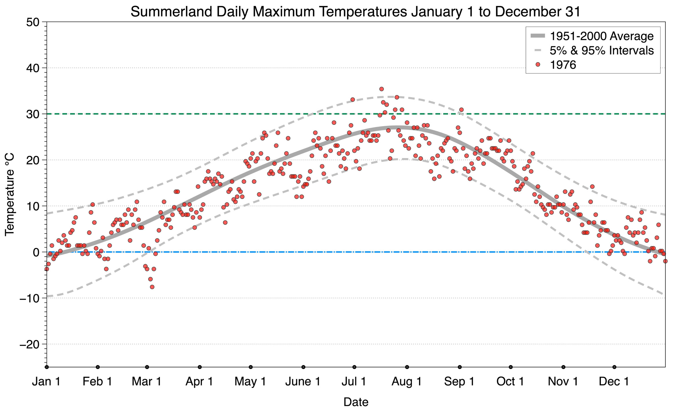 The graph below displays the day-to-day values of maximum daily temperature (red dots) at Summerland for the year 1976. On this graph, the dark grey thick center line is the average daily temperature calculated from 50 years of data from 1951 to 2000. The dotted light grey lines are the 5% and 95% probability intervals - about 90% of the data from 1951 to 2000 fell within these boundaries. Daily temperatures can be considered as extreme cold or extreme hot events if they that fall outside the 5% or 95% probability intervals, respectively. In Canada, temperatures above 30°C (green dotted line) are considered extreme daily temperatures.
