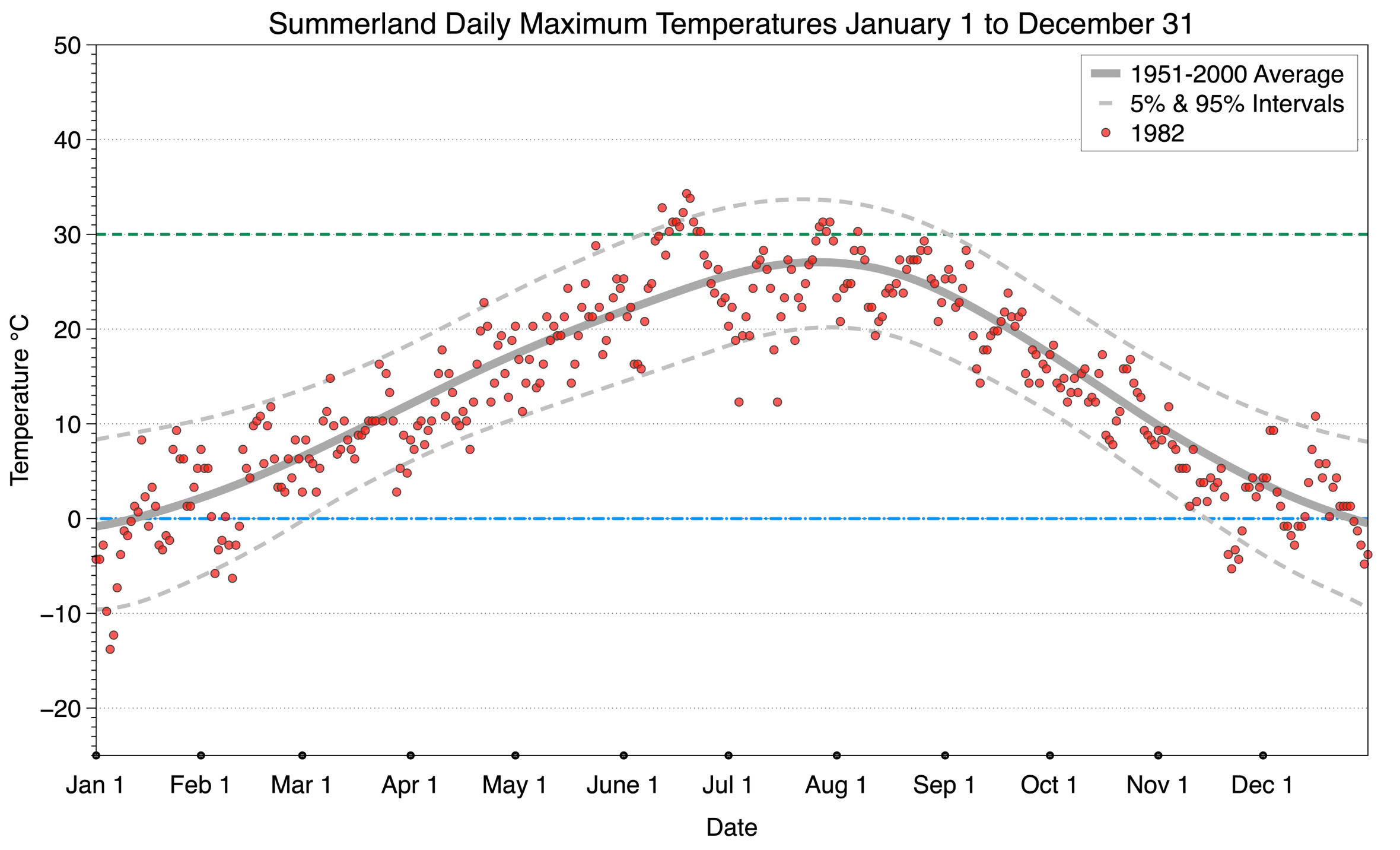 The graph below displays the day-to-day values of maximum daily temperature (red dots) at Summerland for the year 1982. On this graph, the dark grey thick center line is the average daily temperature calculated from 50 years of data from 1951 to 2000. The dotted light grey lines are the 5% and 95% probability intervals - about 90% of the data from 1951 to 2000 fell within these boundaries. Daily temperatures can be considered as extreme cold or extreme hot events if they that fall outside the 5% or 95% probability intervals, respectively. In Canada, temperatures above 30°C (green dotted line) are considered extreme daily temperatures.