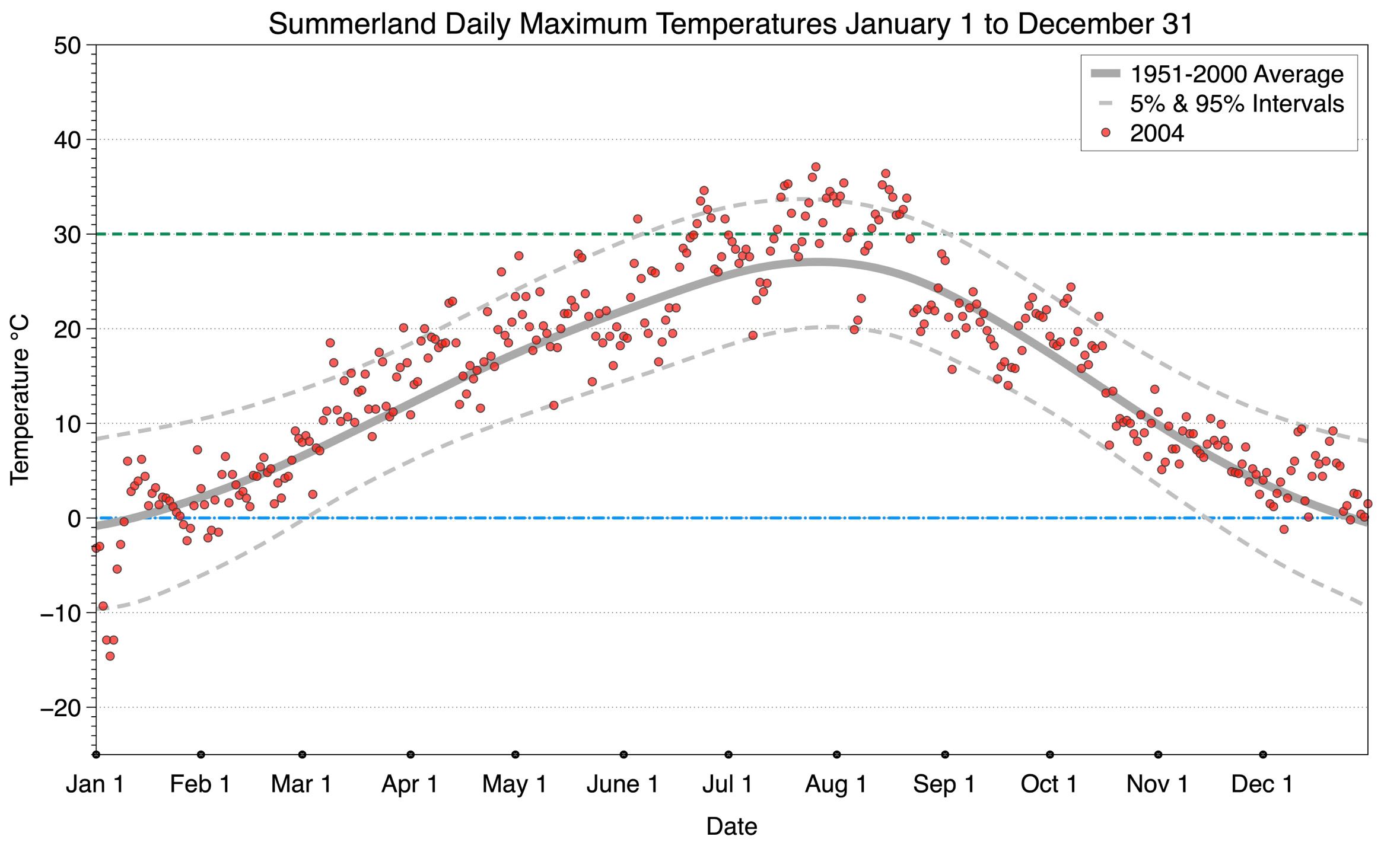 The graph below displays the day-to-day values of maximum daily temperature (red dots) at Summerland for the year 2004. On this graph, the dark grey thick center line is the average daily temperature calculated from 50 years of data from 1951 to 2000. The dotted light grey lines are the 5% and 95% probability intervals - about 90% of the data from 1951 to 2000 fell within these boundaries. Daily temperatures can be considered as extreme cold or extreme hot events if they that fall outside the 5% or 95% probability intervals, respectively. In Canada, temperatures above 30°C (green dotted line) are considered extreme daily temperatures.