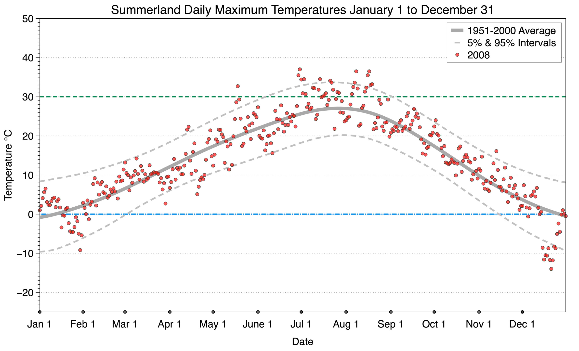 The graph below displays the day-to-day values of maximum daily temperature (red dots) at Summerland for the year 2008. On this graph, the dark grey thick center line is the average daily temperature calculated from 50 years of data from 1951 to 2000. The dotted light grey lines are the 5% and 95% probability intervals - about 90% of the data from 1951 to 2000 fell within these boundaries. Daily temperatures can be considered as extreme cold or extreme hot events if they that fall outside the 5% or 95% probability intervals, respectively. In Canada, temperatures above 30°C (green dotted line) are considered extreme daily temperatures.