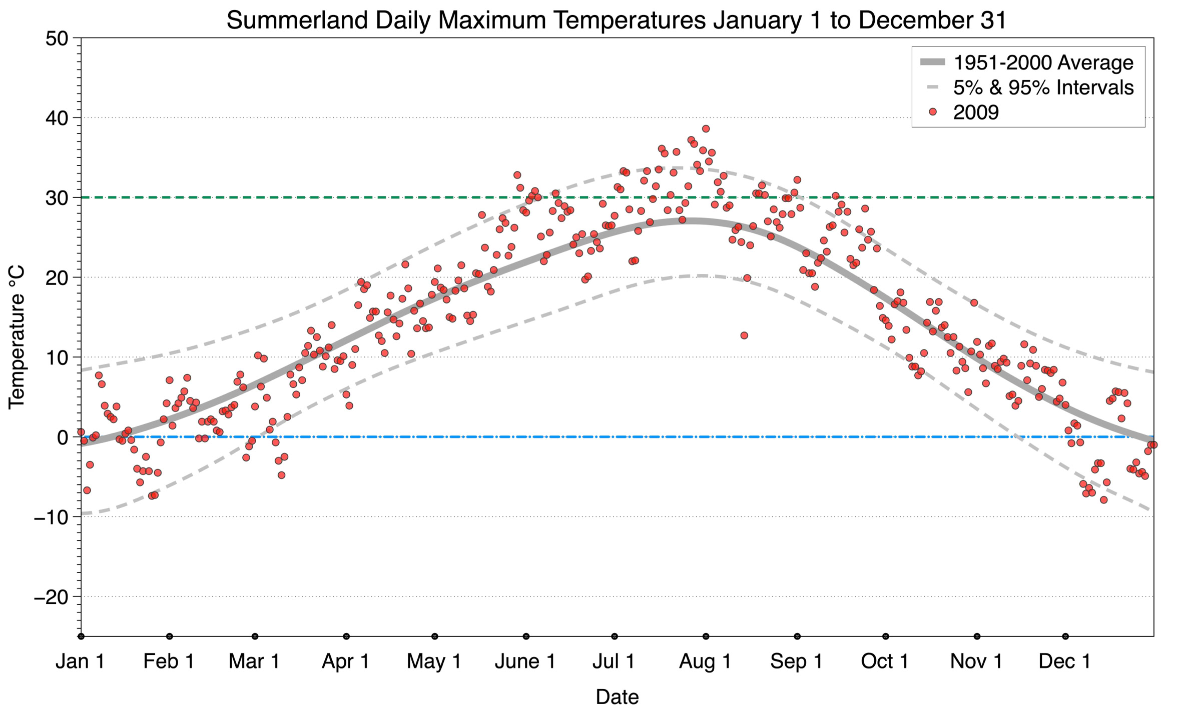 The graph below displays the day-to-day values of maximum daily temperature (red dots) at Summerland for the year 2009. On this graph, the dark grey thick center line is the average daily temperature calculated from 50 years of data from 1951 to 2000. The dotted light grey lines are the 5% and 95% probability intervals - about 90% of the data from 1951 to 2000 fell within these boundaries. Daily temperatures can be considered as extreme cold or extreme hot events if they that fall outside the 5% or 95% probability intervals, respectively. In Canada, temperatures above 30°C (green dotted line) are considered extreme daily temperatures.