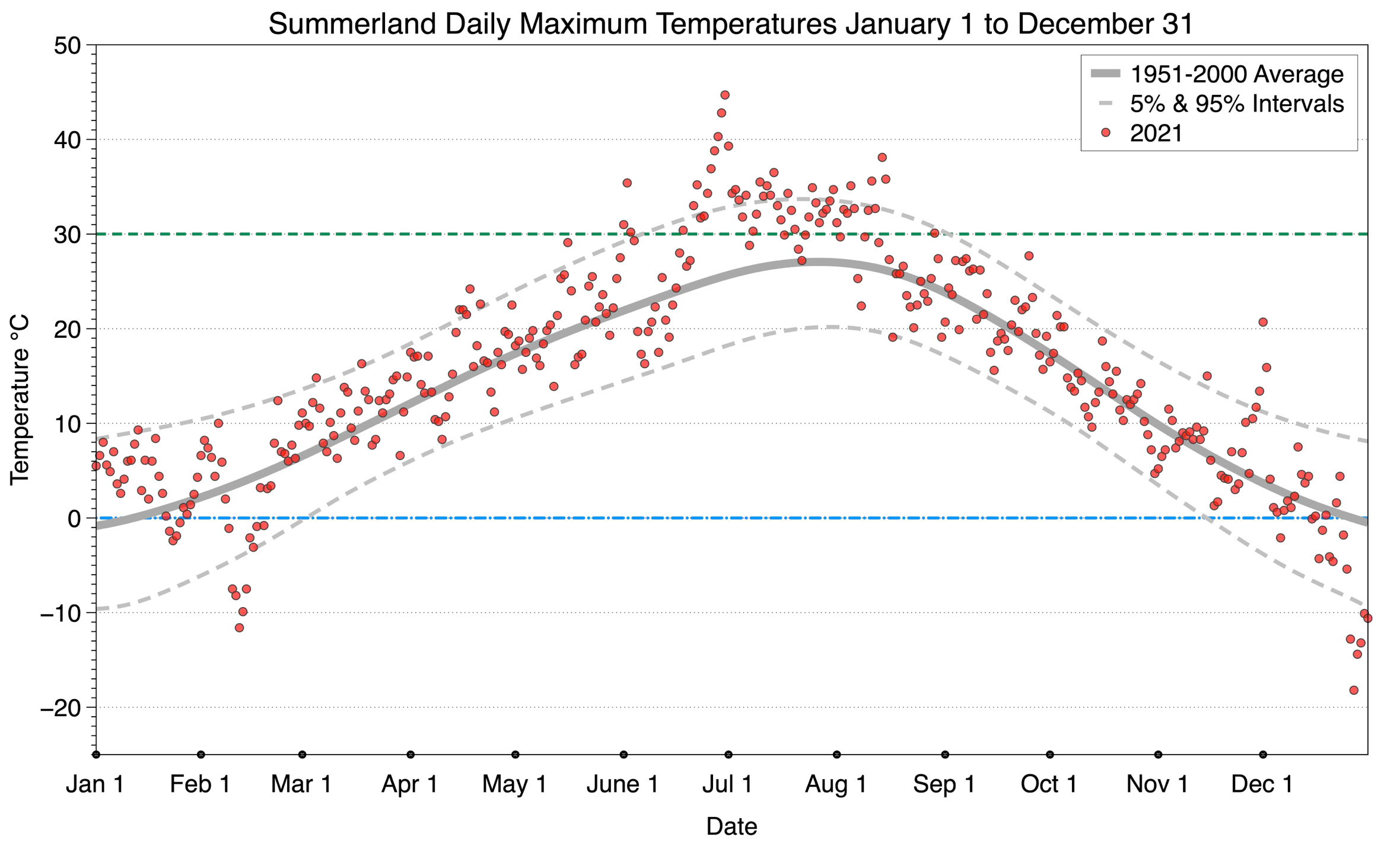 The graph below displays the day-to-day values of maximum daily temperature (red dots) at Summerland for the year 2021. On this graph, the dark grey thick center line is the average daily temperature calculated from 50 years of data from 1951 to 2000. The dotted light grey lines are the 5% and 95% probability intervals - about 90% of the data from 1951 to 2000 fell within these boundaries. Daily temperatures can be considered as extreme cold or extreme hot events if they that fall outside the 5% or 95% probability intervals, respectively. In Canada, temperatures above 30°C (green dotted line) are considered extreme daily temperatures.