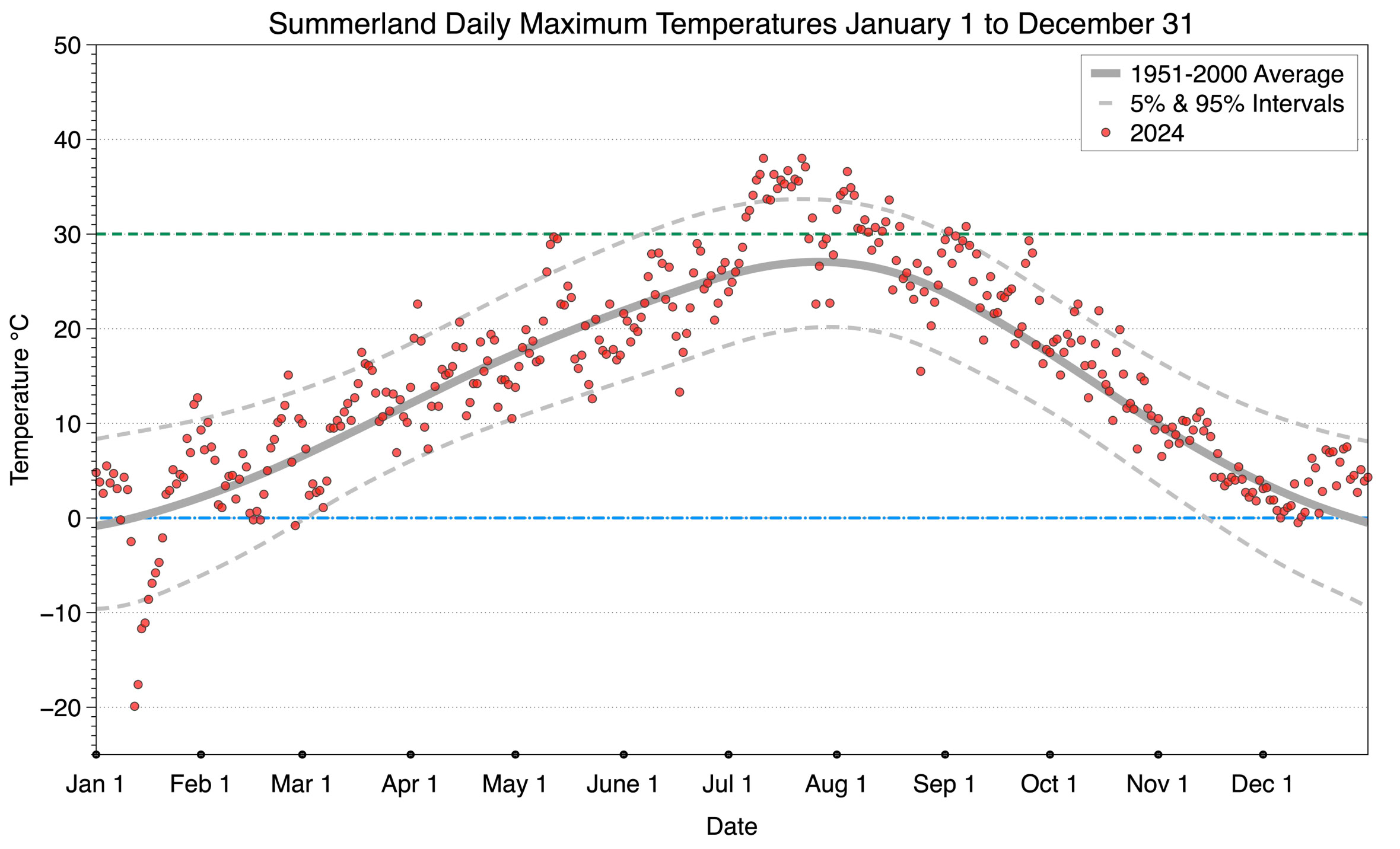 The graph below displays the day-to-day values of maximum daily temperature (red dots) at Summerland for the year 2024. On this graph, the dark grey thick center line is the average daily temperature calculated from 50 years of data from 1951 to 2000. The dotted light grey lines are the 5% and 95% probability intervals - about 90% of the data from 1951 to 2000 fell within these boundaries. Daily temperatures can be considered as extreme cold or extreme hot events if they that fall outside the 5% or 95% probability intervals, respectively. In Canada, temperatures above 30°C (green dotted line) are considered extreme daily temperatures.