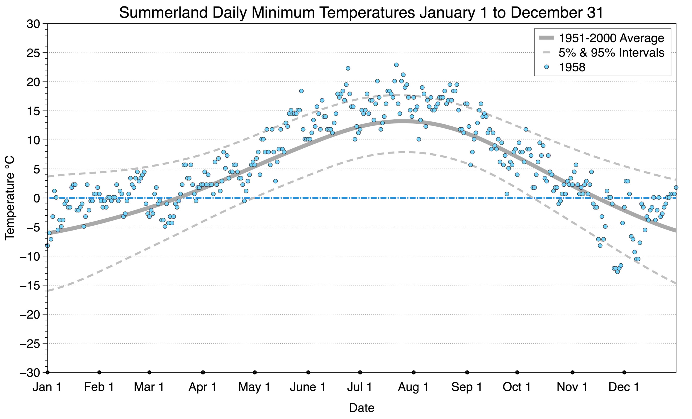 The graph below displays the day-to-day values of minimum daily temperature (blue dots) at Summerland for the year 1958. On this graph, the dark grey thick center line is the average daily temperature calculated from 50 years of data from 1951 to 2000. The dotted light grey lines are the 5% and 95% probability intervals - about 90% of the data from 1951 to 2000 fell within these boundaries. Daily temperatures can be considered as extreme cold or extreme hot events if they that fall outside the 5% or 95% probability intervals, respectively.
