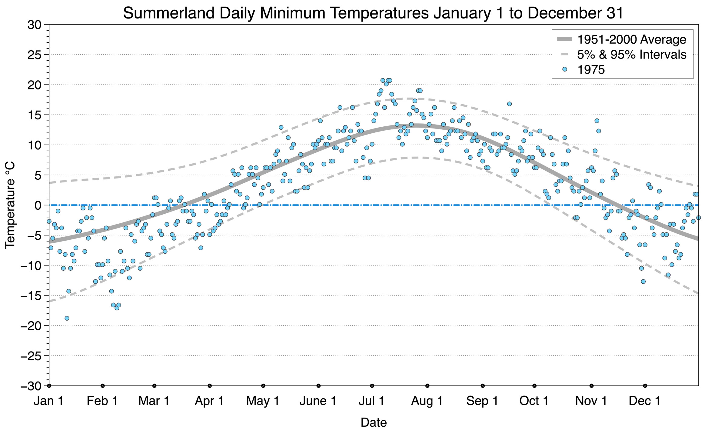 The graph below displays the day-to-day values of minimum daily temperature (blue dots) at Summerland for the year 1975. On this graph, the dark grey thick center line is the average daily temperature calculated from 50 years of data from 1951 to 2000. The dotted light grey lines are the 5% and 95% probability intervals - about 90% of the data from 1951 to 2000 fell within these boundaries. Daily temperatures can be considered as extreme cold or extreme hot events if they that fall outside the 5% or 95% probability intervals, respectively.