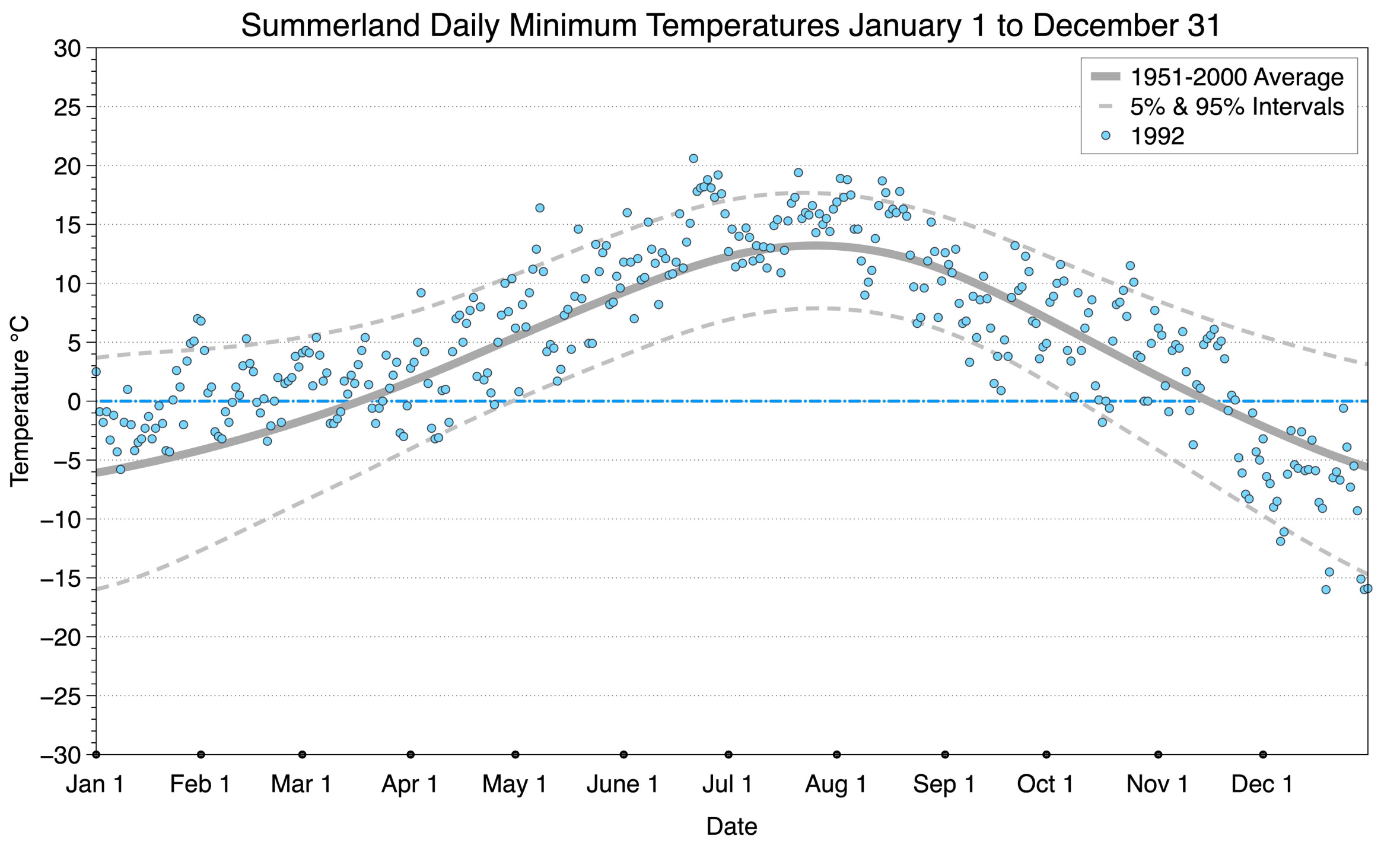The graph below displays the day-to-day values of minimum daily temperature (blue dots) at Summerland for the year 1992. On this graph, the dark grey thick center line is the average daily temperature calculated from 50 years of data from 1951 to 2000. The dotted light grey lines are the 5% and 95% probability intervals - about 90% of the data from 1951 to 2000 fell within these boundaries. Daily temperatures can be considered as extreme cold or extreme hot events if they that fall outside the 5% or 95% probability intervals, respectively.