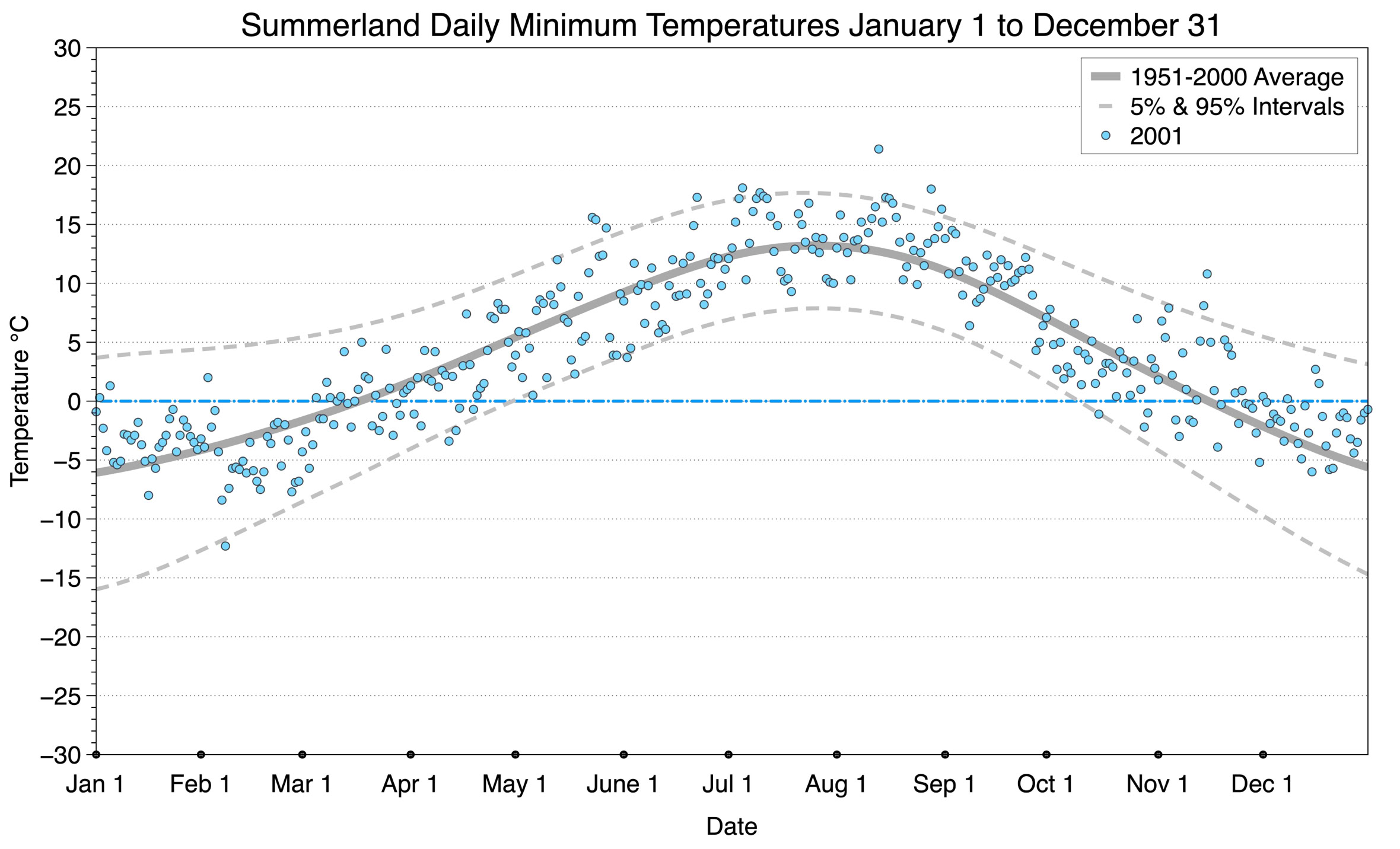 The graph below displays the day-to-day values of minimum daily temperature (blue dots) at Summerland for the year 2001. On this graph, the dark grey thick center line is the average daily temperature calculated from 50 years of data from 1951 to 2000. The dotted light grey lines are the 5% and 95% probability intervals - about 90% of the data from 1951 to 2000 fell within these boundaries. Daily temperatures can be considered as extreme cold or extreme hot events if they that fall outside the 5% or 95% probability intervals, respectively.