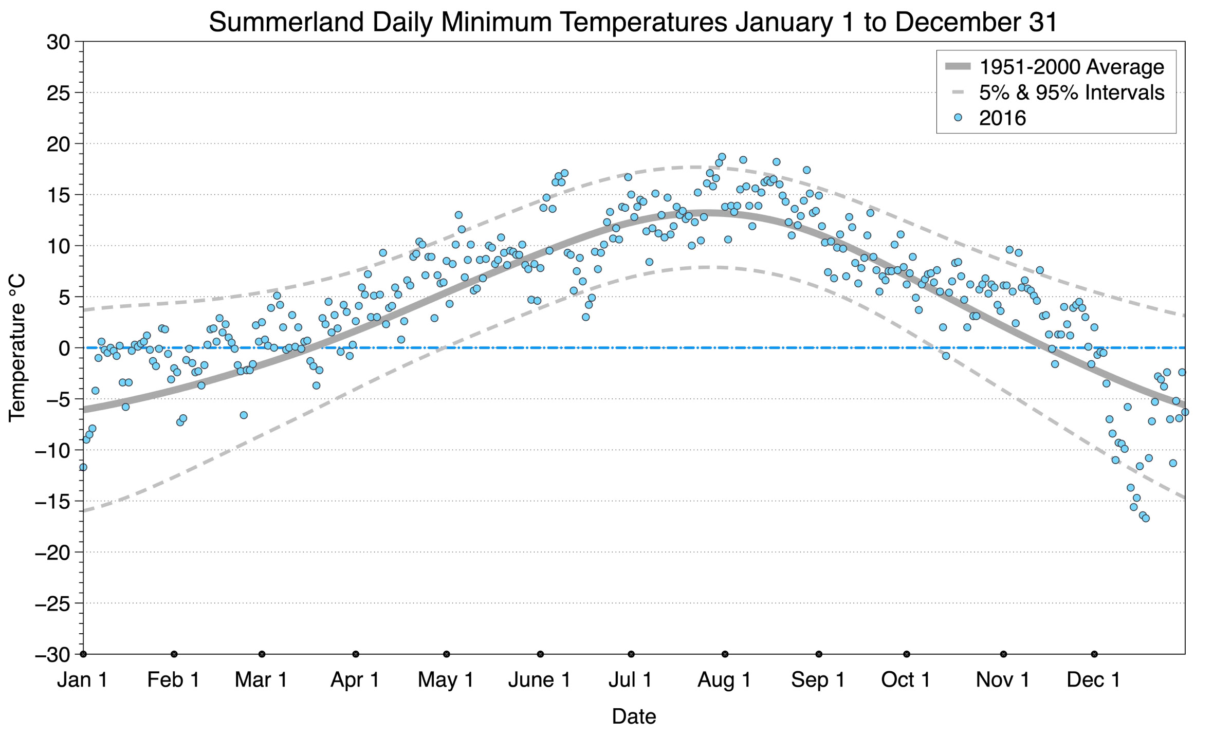 The graph below displays the day-to-day values of minimum daily temperature (blue dots) at Summerland for the year 2016. On this graph, the dark grey thick center line is the average daily temperature calculated from 50 years of data from 1951 to 2000. The dotted light grey lines are the 5% and 95% probability intervals - about 90% of the data from 1951 to 2000 fell within these boundaries. Daily temperatures can be considered as extreme cold or extreme hot events if they that fall outside the 5% or 95% probability intervals, respectively.
