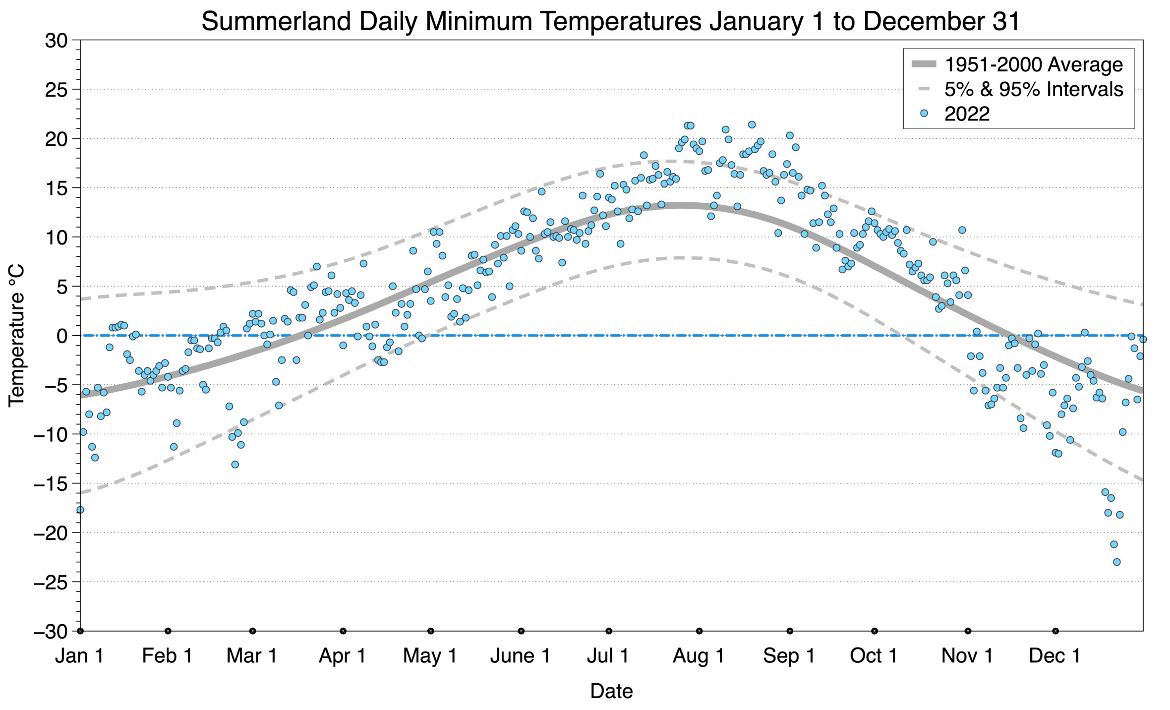 The graph below displays the day-to-day values of minimum daily temperature (blue dots) at Summerland for the year 2022. On this graph, the dark grey thick center line is the average daily temperature calculated from 50 years of data from 1951 to 2000. The dotted light grey lines are the 5% and 95% probability intervals - about 90% of the data from 1951 to 2000 fell within these boundaries. Daily temperatures can be considered as extreme cold or extreme hot events if they that fall outside the 5% or 95% probability intervals, respectively.