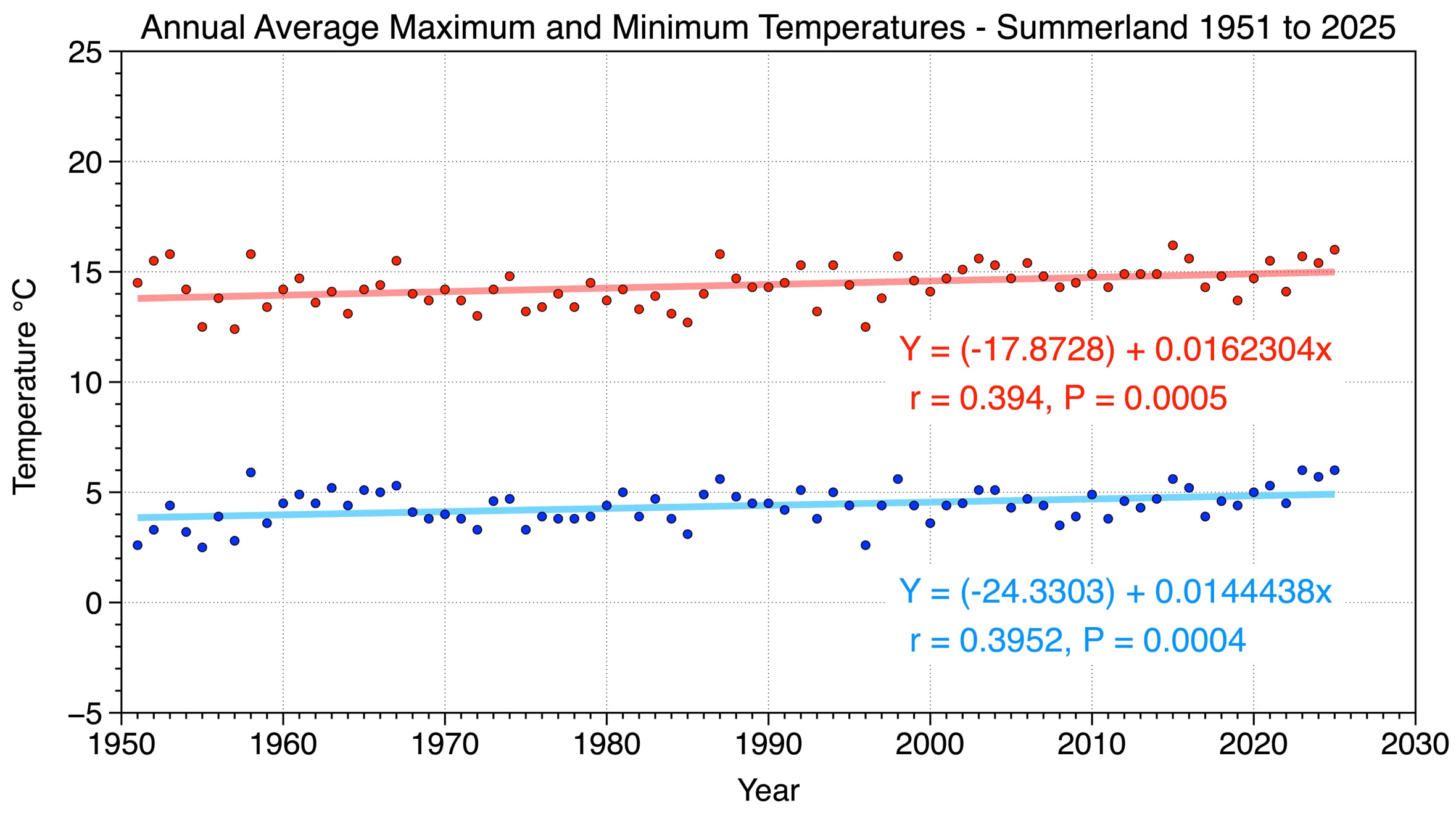 Figure 3 Summerland’s annual average maximum and minimum temperatures from 1951 to 2025. Regression analysis suggests that annual average maximum temperature has been steadily increasing at a rate of 0.16°C per decade, while annual average minimum temperature has been steadily increasing at a rate of 0.14°C per decade.