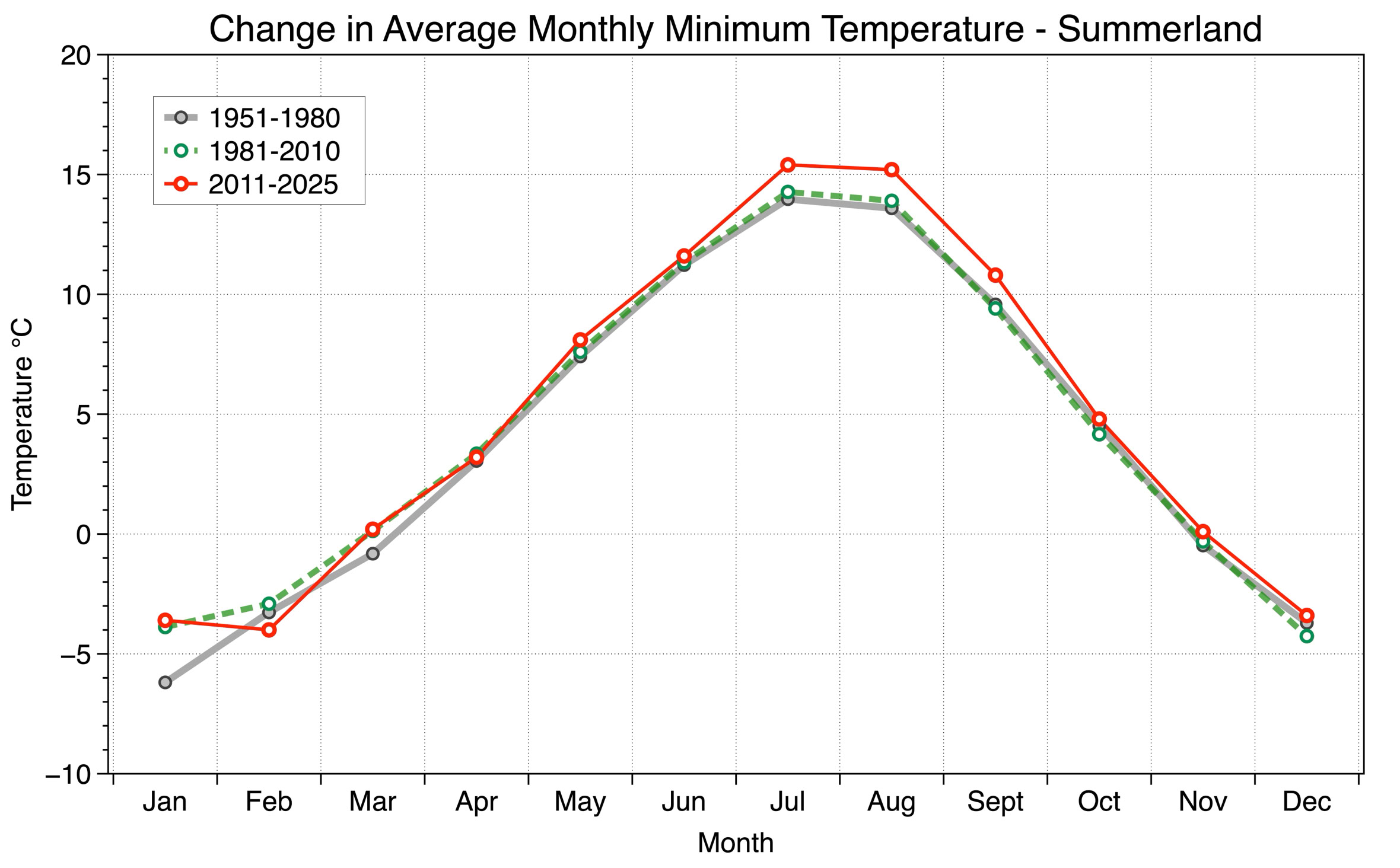 Figure 9 The historical change in average monthly minimum temperatures for three periods: 1951 to 1980, 1981 to 2010, and 2011 to 2025.