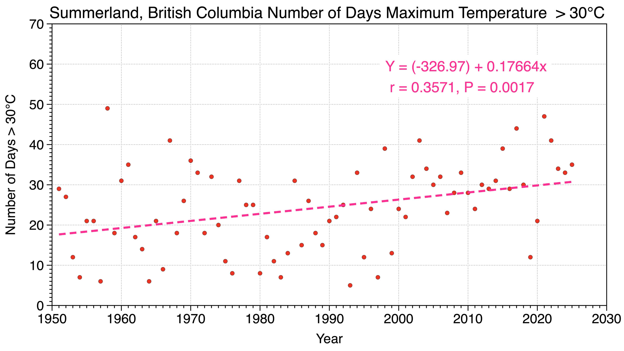 Figure 11 Yearly number of maximum daily temperature events > 30°C from 1951 to 2025 in Summerland. Maximum daily temperature events > 30°C have been steadily increasing at a rate of around 1.8 days per decade according to linear regression analysis.