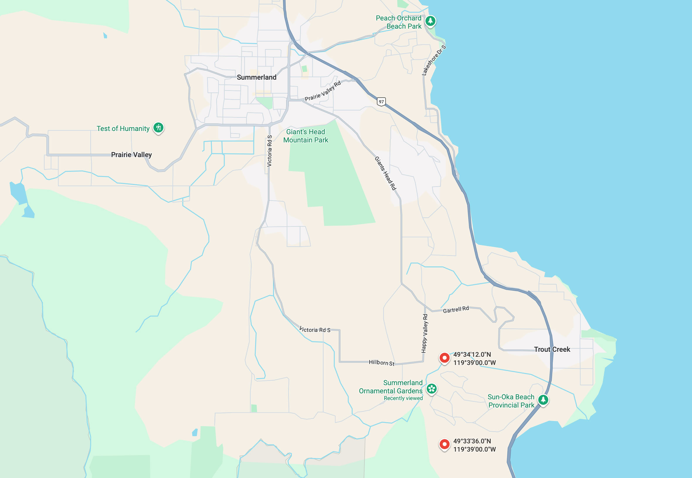Figure 1 Location of the two weather stations used to reconstruct Summerland’s climate record.