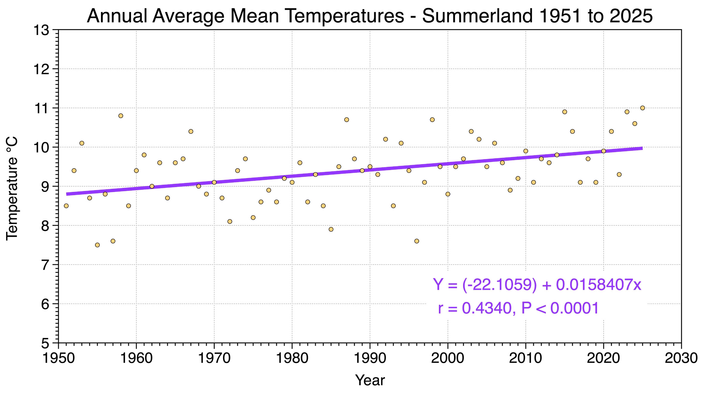 Figure 2 Summerland’s annual average mean temperatures from 1951 to 2025. Annual average mean temperature has been steadily increasing at a rate of 0.16°C per decade according to linear regression analysis.