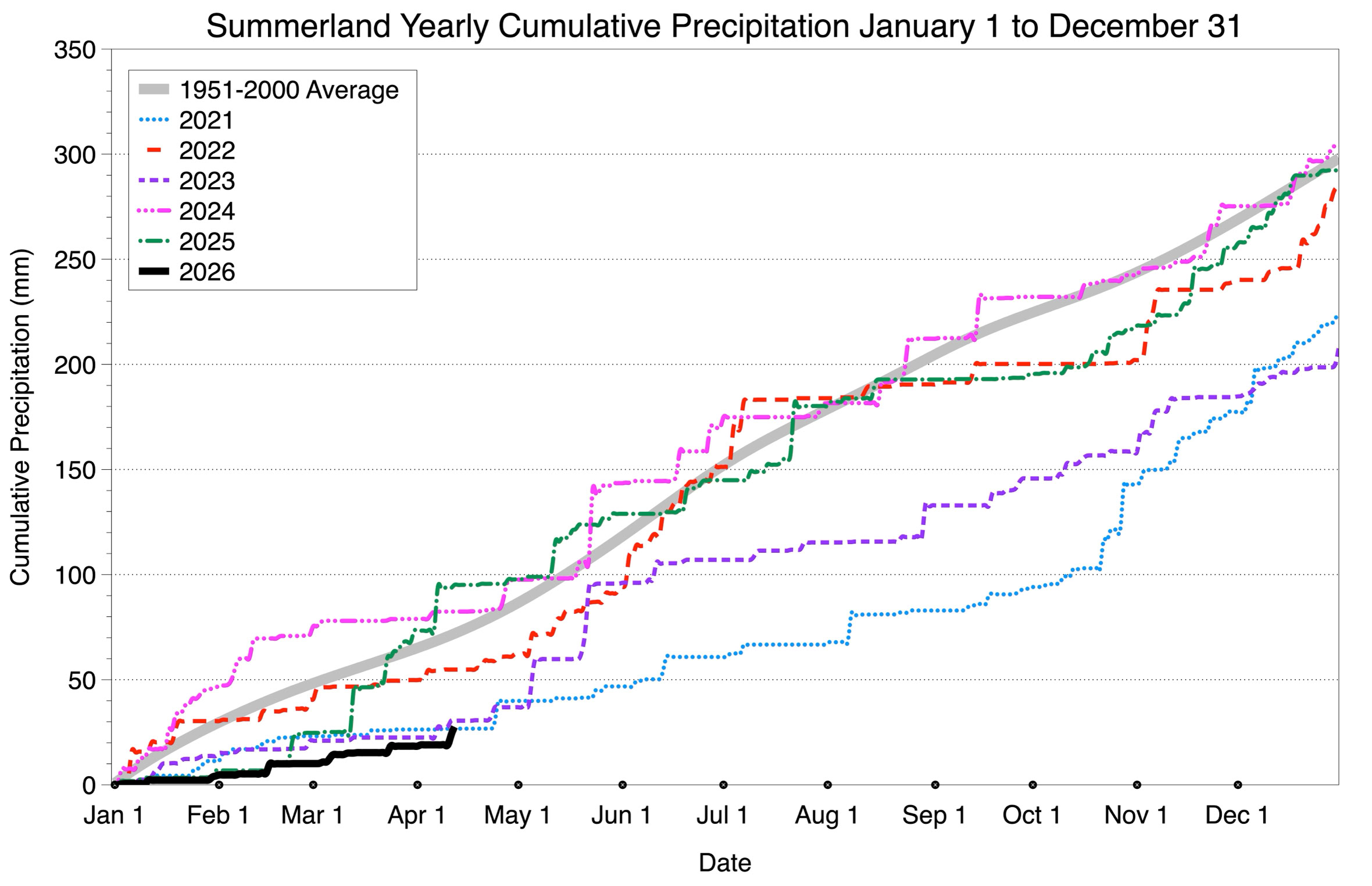 The graph below shows Summerland’s cumulative precipitation from January 1 to December 31. Six years are displayed - 2026, 2025, 2024, 2023, 2022, and 2021. The grey thick line is the average cumulative precipitation calculated from 50 years of data from 1951 to 2000. Average total cumulative precipitation for 1951 to 2000 by December 31 is 291 mm. An extreme Summer (June 1 to August 31) drought occurred in 2021 when cumulative precipitation was less than 50% of normal. 2023 also a below-normal year for summer precipitation, is considered the most destructive wildfire season ever recorded in British Columbia. As shown, 2026 is off to a bad start with cumulative precipitation around 39% of the 1951 to 2000 average.