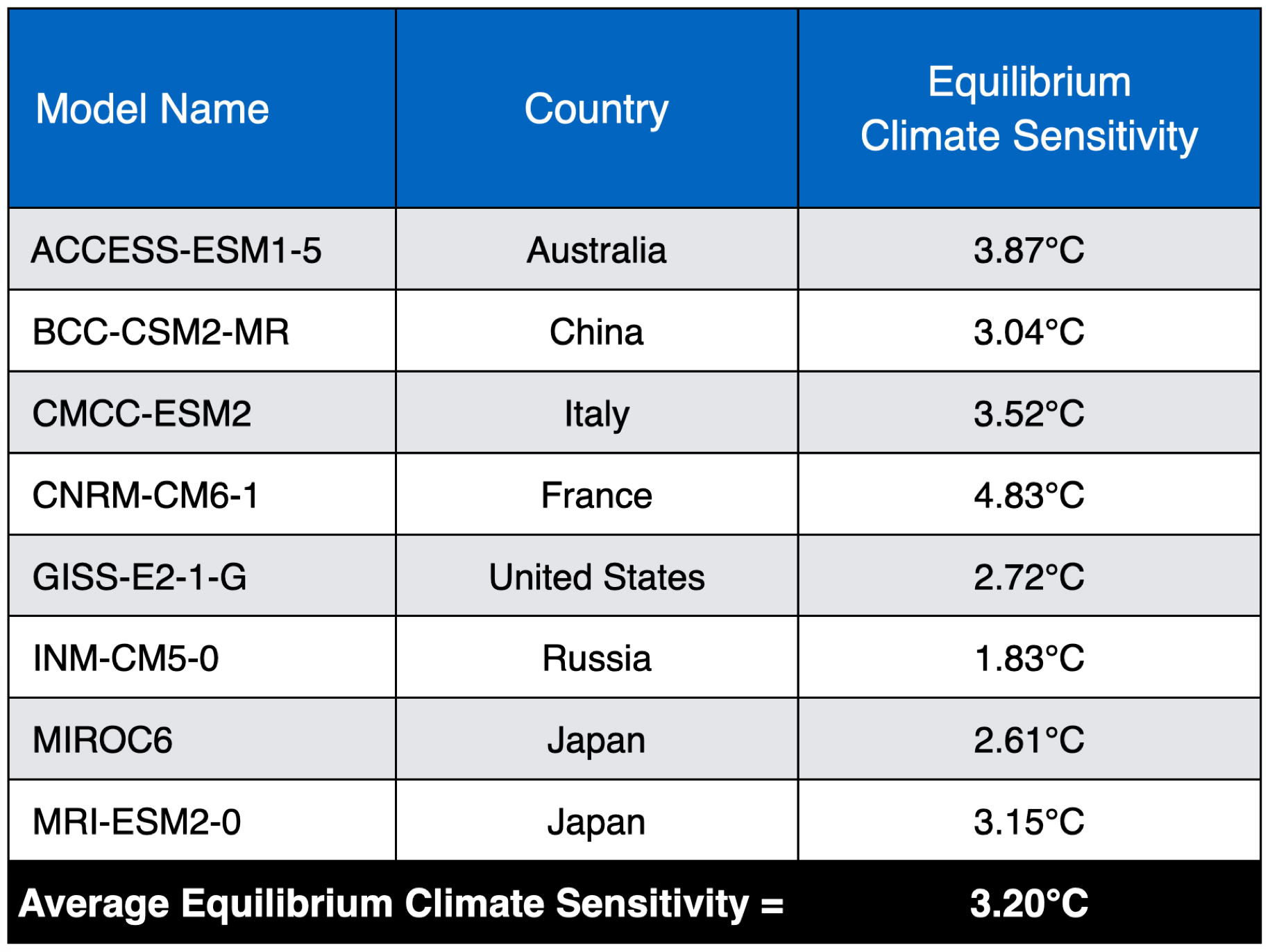 Forecasts of Vernons’s future near surface air temperatures and precipitation were made using a stochastic weather simulator called LARS-WG version 8.0. This software uses site-specific historical daily weather measurements to make future predictions. In this case, I selected 30 years of daily measurements from 1991 to 2020. From this historical data, probability distributions were computed by the software that capture the observed variability and extremes in historical air temperature and precipitation. This software can then intergrate these calculated probability distributions with the outputs of up to fifteen Global Climate Models from the Coupled Model Intercomparison Project Phase 6 (CMIP6) to generate daily-scale future forecasts. A subset of eight climate models was selected whose output was averaged to produce a single forecast with an Equilibrium Climate Sensitivity of 3.2°C. This approach is called climate ensemble modeling. The names, country of origin, and the Equilibium Climate Sensitivity of these eight models are described in Table 1.