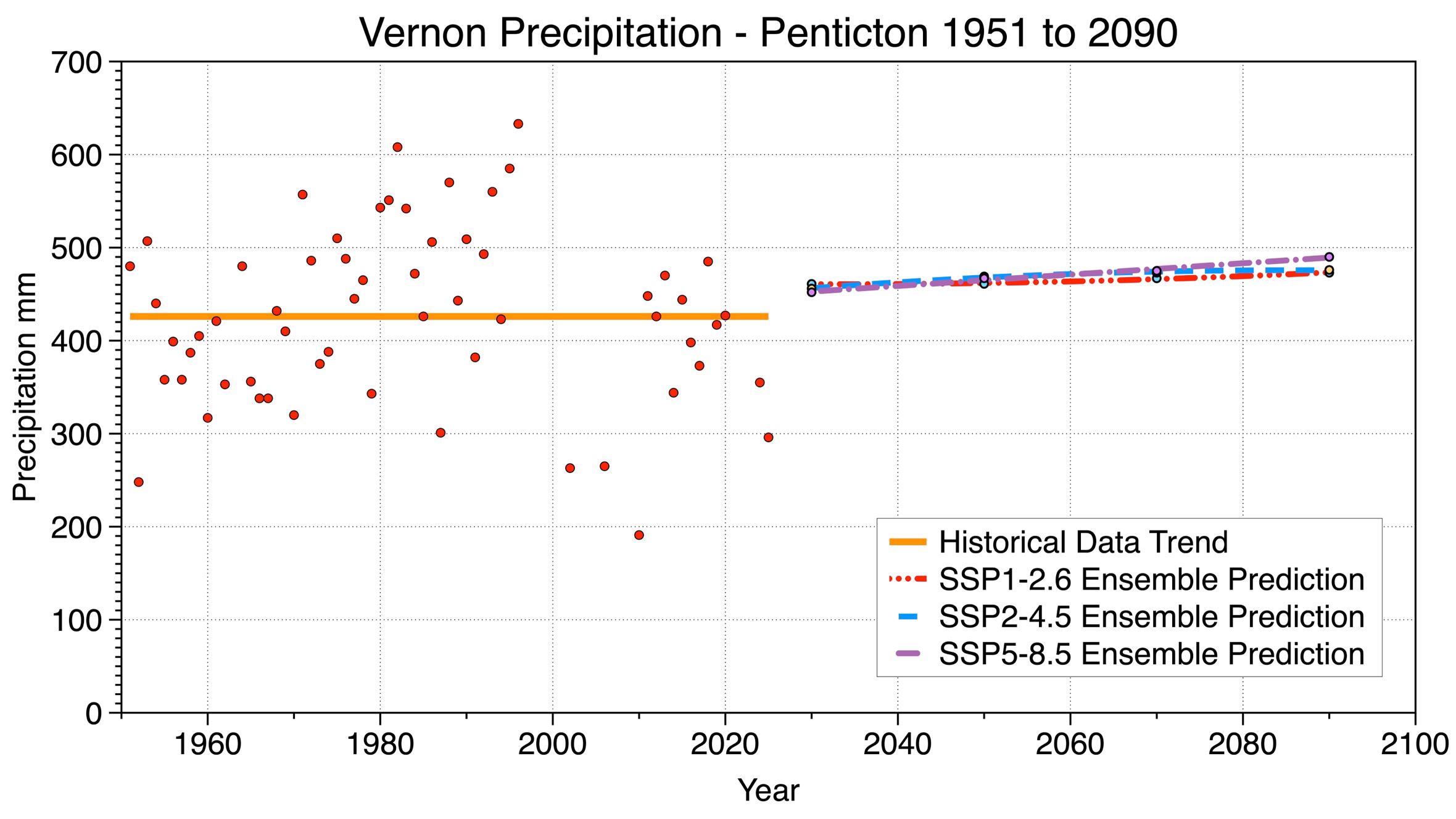 Figure 2 Eight-model ensemble forecasted changes in Vernon’s annual precipitation under SSP1-2.6, SSP2-4.5, and SSP5-8.5 emission scenarios from 2030 to 2090. Also shown is the historical measurements of annual precipitation from 1951 to 2025, and a line (orange colored) describing the average annual precipitation (426 mm) for the historical years plotted on the graph.