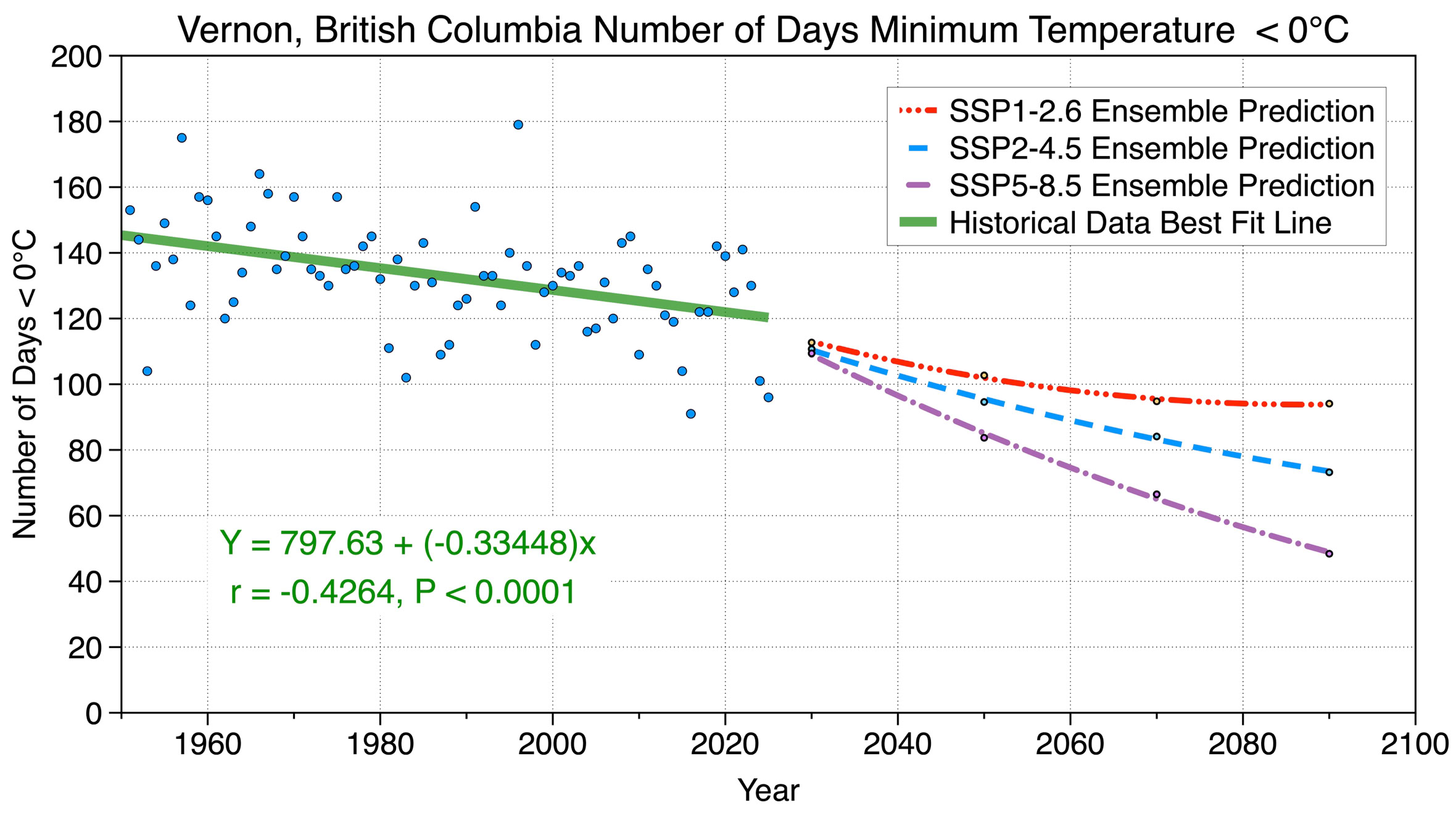 Figure 10 Eight-model ensemble forecasted changes in Vernon’s annual number of days with a minimum temperature less than (<) 0°C under SSP1-2.6, SSP2-4.5, and SSP5-8.5 emission scenarios from 2030 to 2090. Also shown is the historical measurements of the annual number of days with a minimum temperature less than (<) 0°C from 1951-2025, and a best-fit linear regression line (green line) describing the average change in this climate variable during this period.