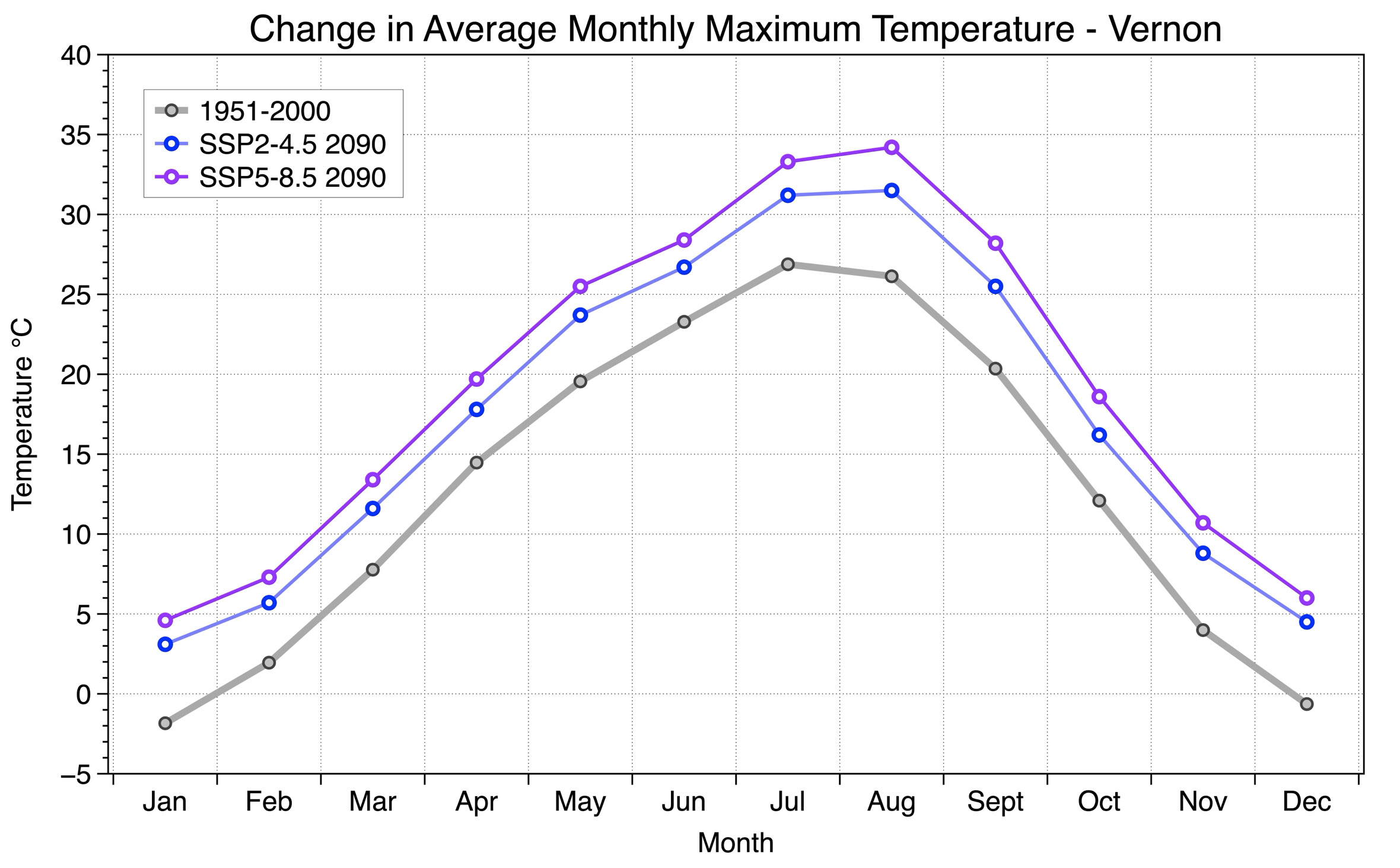 Figure 8 Future change in average monthly minimum temperatures at Vernon from 1951-2000 to 2090 for the SSP2-4.5 and SSP5-8.5 greenhouse gas emission scenarios.