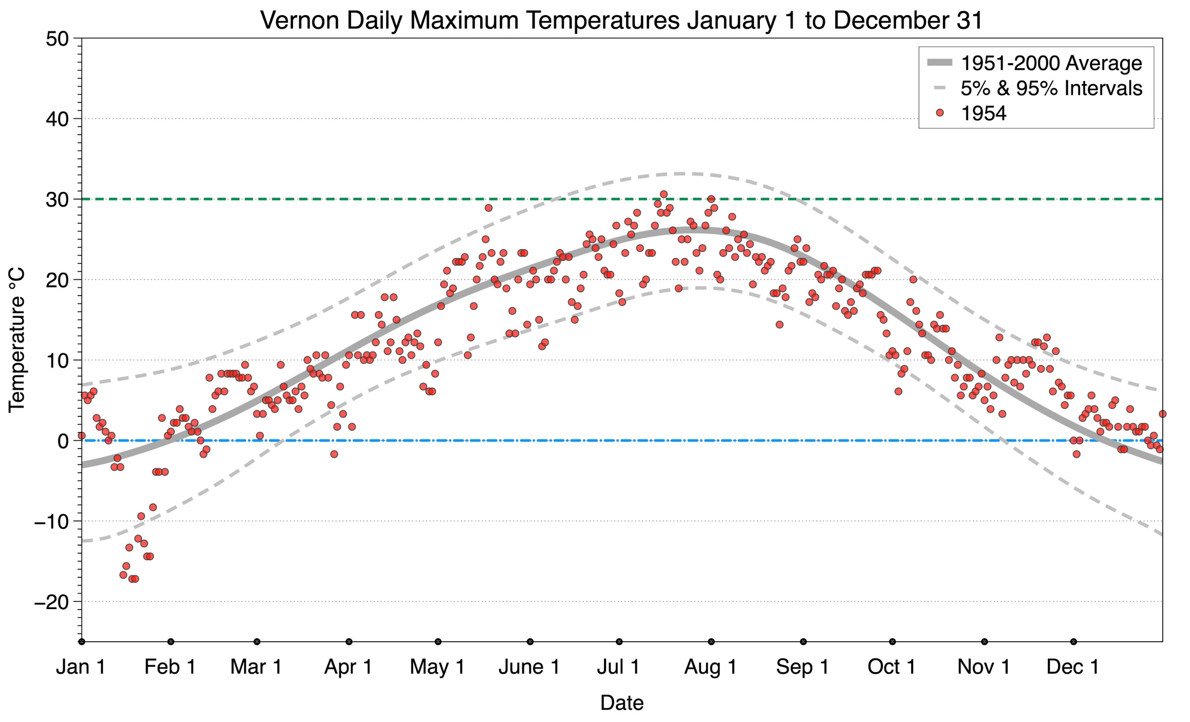The graph below displays the day-to-day values of maximum daily temperature (red dots) at Vernon for the year 1954. On this graph, the dark grey thick center line is the average daily temperature calculated from 50 years of data from 1951 to 2000. The dotted light grey lines are the 5% and 95% probability intervals - about 90% of the data from 1951 to 2000 fell within these boundaries. Daily temperatures can be considered as extreme cold or extreme hot events if they that fall outside the 5% or 95% probability intervals, respectively. In Canada, temperatures above 30°C (green dotted line) are considered extreme daily temperatures.