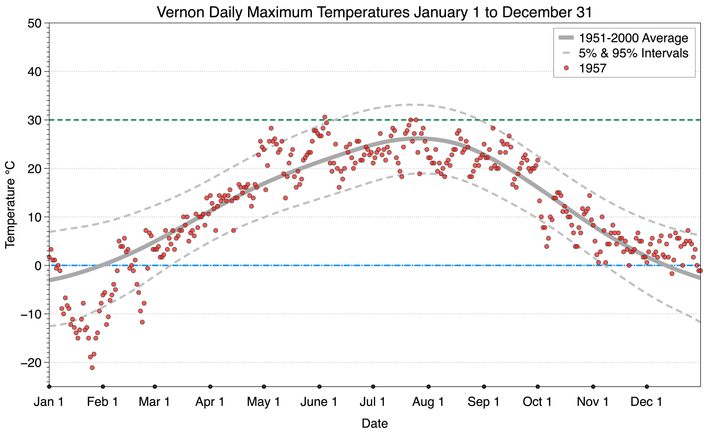 The graph below displays the day-to-day values of maximum daily temperature (red dots) at Vernon for the year 1957. On this graph, the dark grey thick center line is the average daily temperature calculated from 50 years of data from 1951 to 2000. The dotted light grey lines are the 5% and 95% probability intervals - about 90% of the data from 1951 to 2000 fell within these boundaries. Daily temperatures can be considered as extreme cold or extreme hot events if they that fall outside the 5% or 95% probability intervals, respectively. In Canada, temperatures above 30°C (green dotted line) are considered extreme daily temperatures.