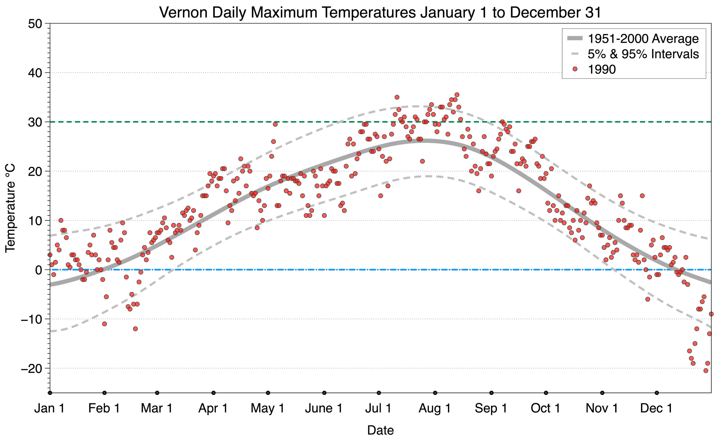 The graph below displays the day-to-day values of maximum daily temperature (red dots) at Vernon for the year 1990. On this graph, the dark grey thick center line is the average daily temperature calculated from 50 years of data from 1951 to 2000. The dotted light grey lines are the 5% and 95% probability intervals - about 90% of the data from 1951 to 2000 fell within these boundaries. Daily temperatures can be considered as extreme cold or extreme hot events if they that fall outside the 5% or 95% probability intervals, respectively. In Canada, temperatures above 30°C (green dotted line) are considered extreme daily temperatures.