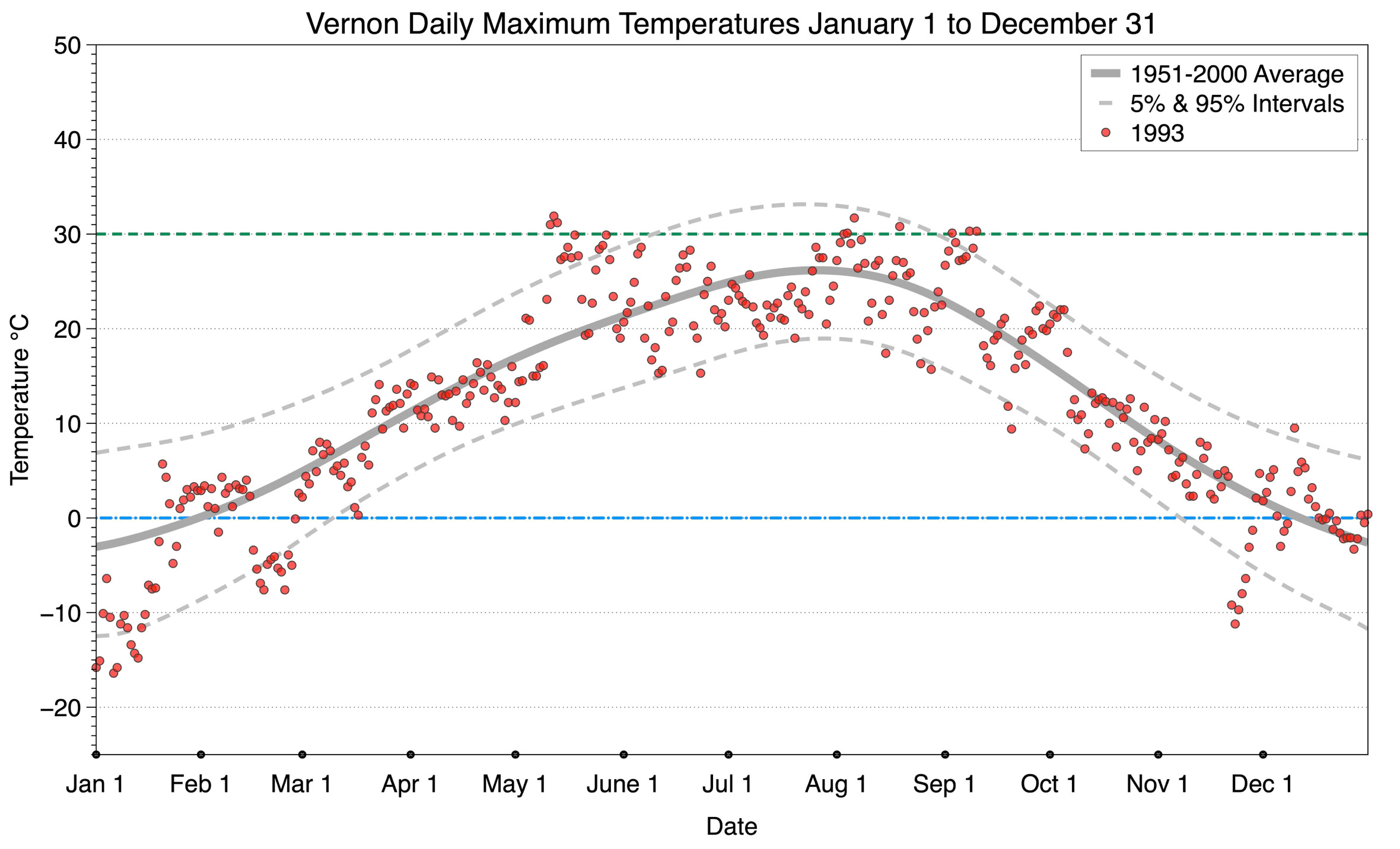 The graph below displays the day-to-day values of maximum daily temperature (red dots) at Vernon for the year 1993. On this graph, the dark grey thick center line is the average daily temperature calculated from 50 years of data from 1951 to 2000. The dotted light grey lines are the 5% and 95% probability intervals - about 90% of the data from 1951 to 2000 fell within these boundaries. Daily temperatures can be considered as extreme cold or extreme hot events if they that fall outside the 5% or 95% probability intervals, respectively. In Canada, temperatures above 30°C (green dotted line) are considered extreme daily temperatures.
