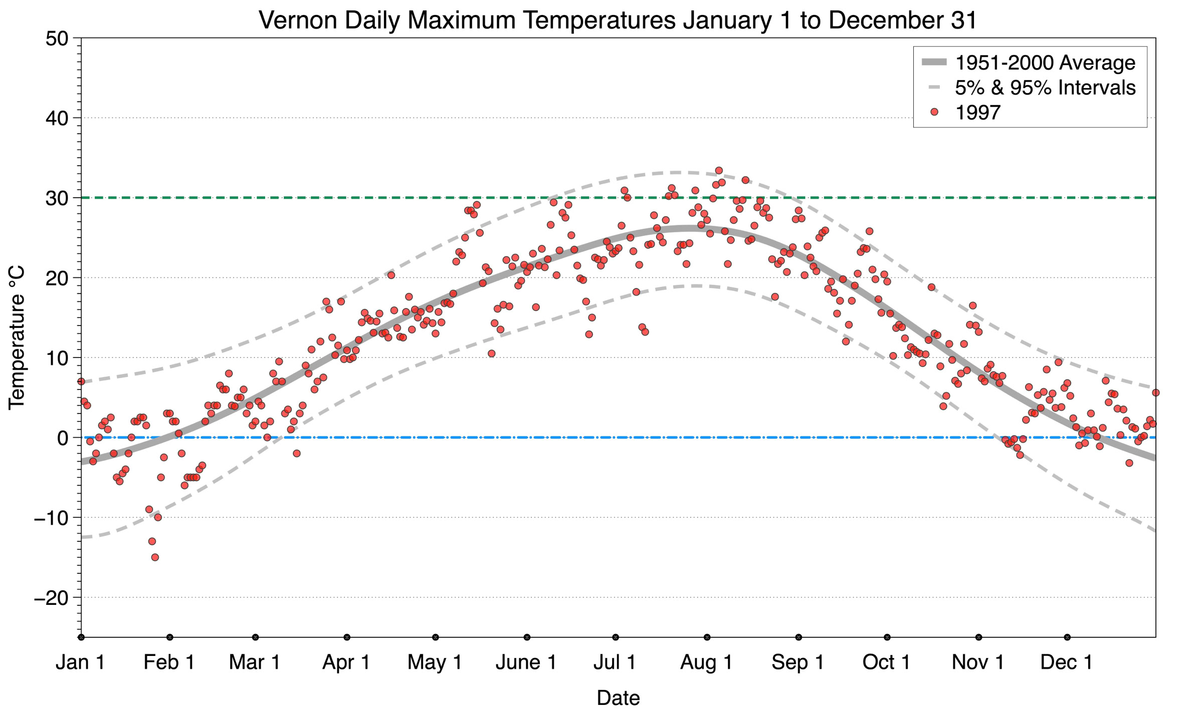 The graph below displays the day-to-day values of maximum daily temperature (red dots) at Vernon for the year 1997. On this graph, the dark grey thick center line is the average daily temperature calculated from 50 years of data from 1951 to 2000. The dotted light grey lines are the 5% and 95% probability intervals - about 90% of the data from 1951 to 2000 fell within these boundaries. Daily temperatures can be considered as extreme cold or extreme hot events if they that fall outside the 5% or 95% probability intervals, respectively. In Canada, temperatures above 30°C (green dotted line) are considered extreme daily temperatures.