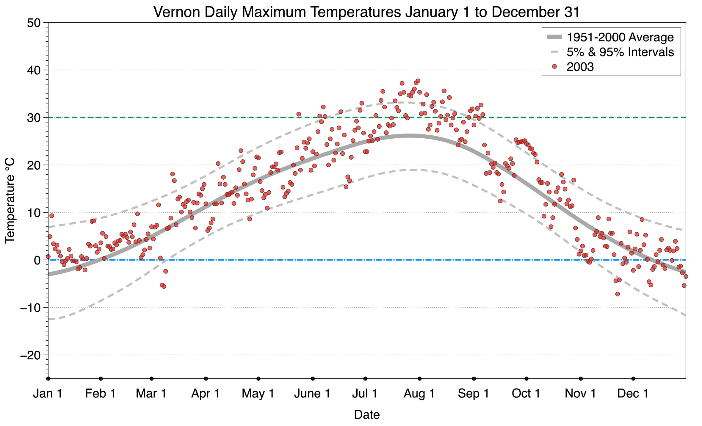 The graph below displays the day-to-day values of maximum daily temperature (red dots) at Vernon for the year 2003. On this graph, the dark grey thick center line is the average daily temperature calculated from 50 years of data from 1951 to 2000. The dotted light grey lines are the 5% and 95% probability intervals - about 90% of the data from 1951 to 2000 fell within these boundaries. Daily temperatures can be considered as extreme cold or extreme hot events if they that fall outside the 5% or 95% probability intervals, respectively. In Canada, temperatures above 30°C (green dotted line) are considered extreme daily temperatures.