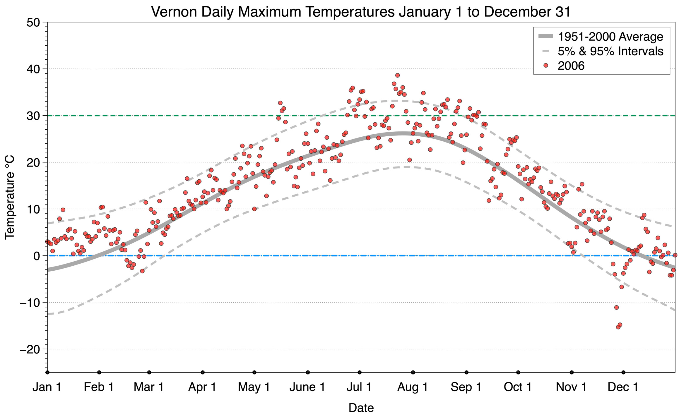 The graph below displays the day-to-day values of maximum daily temperature (red dots) at Vernon for the year 2006. On this graph, the dark grey thick center line is the average daily temperature calculated from 50 years of data from 1951 to 2000. The dotted light grey lines are the 5% and 95% probability intervals - about 90% of the data from 1951 to 2000 fell within these boundaries. Daily temperatures can be considered as extreme cold or extreme hot events if they that fall outside the 5% or 95% probability intervals, respectively. In Canada, temperatures above 30°C (green dotted line) are considered extreme daily temperatures.