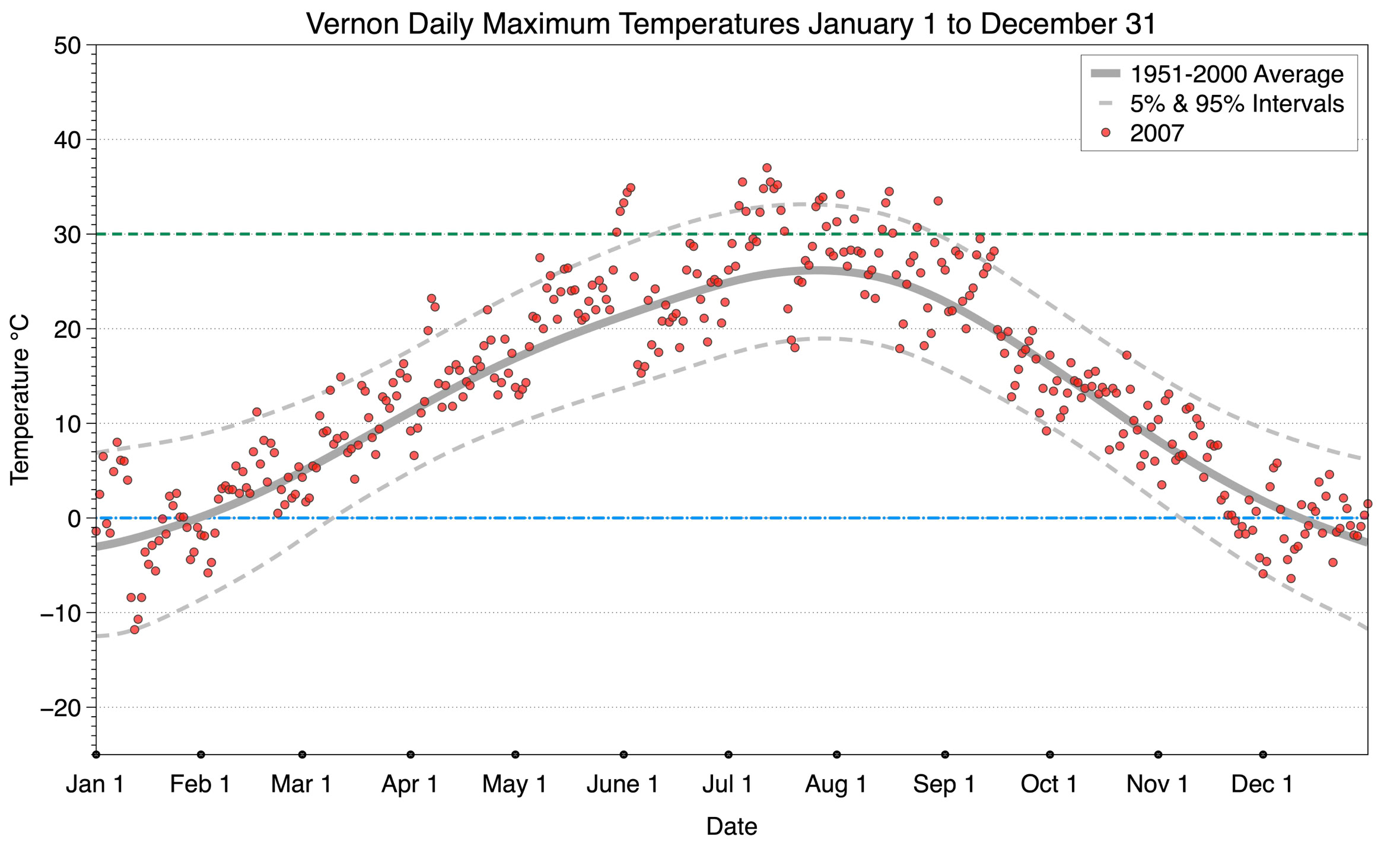 The graph below displays the day-to-day values of maximum daily temperature (red dots) at Vernon for the year 2007. On this graph, the dark grey thick center line is the average daily temperature calculated from 50 years of data from 1951 to 2000. The dotted light grey lines are the 5% and 95% probability intervals - about 90% of the data from 1951 to 2000 fell within these boundaries. Daily temperatures can be considered as extreme cold or extreme hot events if they that fall outside the 5% or 95% probability intervals, respectively. In Canada, temperatures above 30°C (green dotted line) are considered extreme daily temperatures.