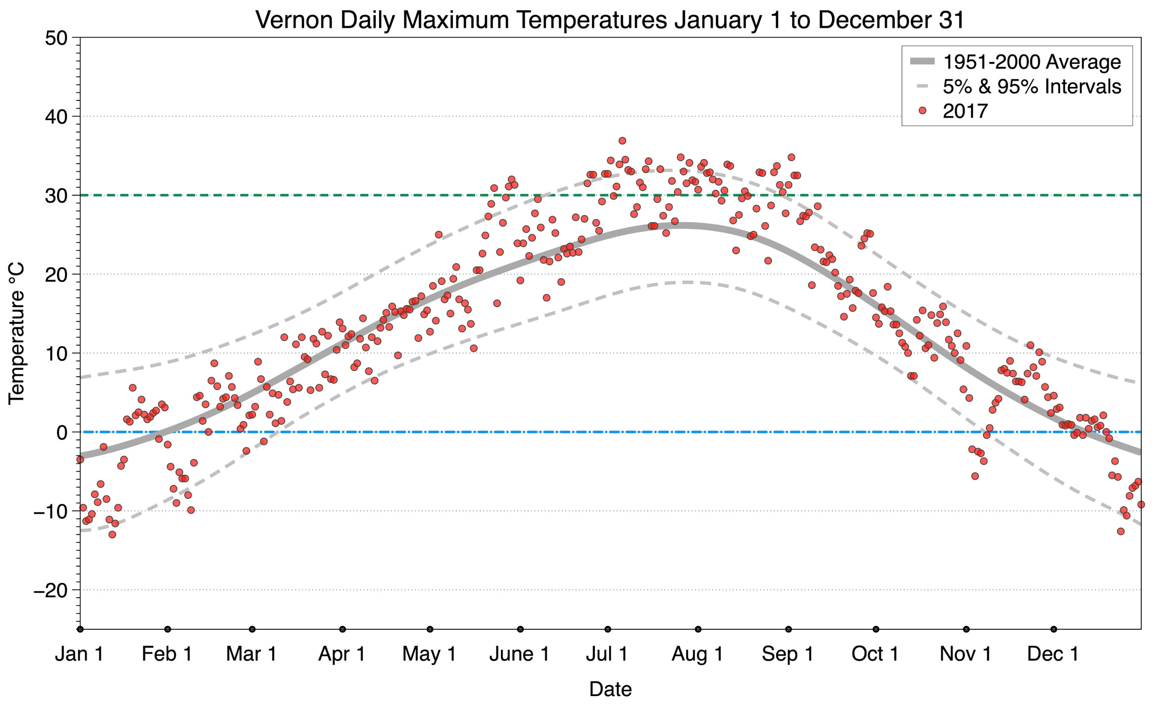 The graph below displays the day-to-day values of maximum daily temperature (red dots) at Vernon for the year 2017. On this graph, the dark grey thick center line is the average daily temperature calculated from 50 years of data from 1951 to 2000. The dotted light grey lines are the 5% and 95% probability intervals - about 90% of the data from 1951 to 2000 fell within these boundaries. Daily temperatures can be considered as extreme cold or extreme hot events if they that fall outside the 5% or 95% probability intervals, respectively. In Canada, temperatures above 30°C (green dotted line) are considered extreme daily temperatures.
