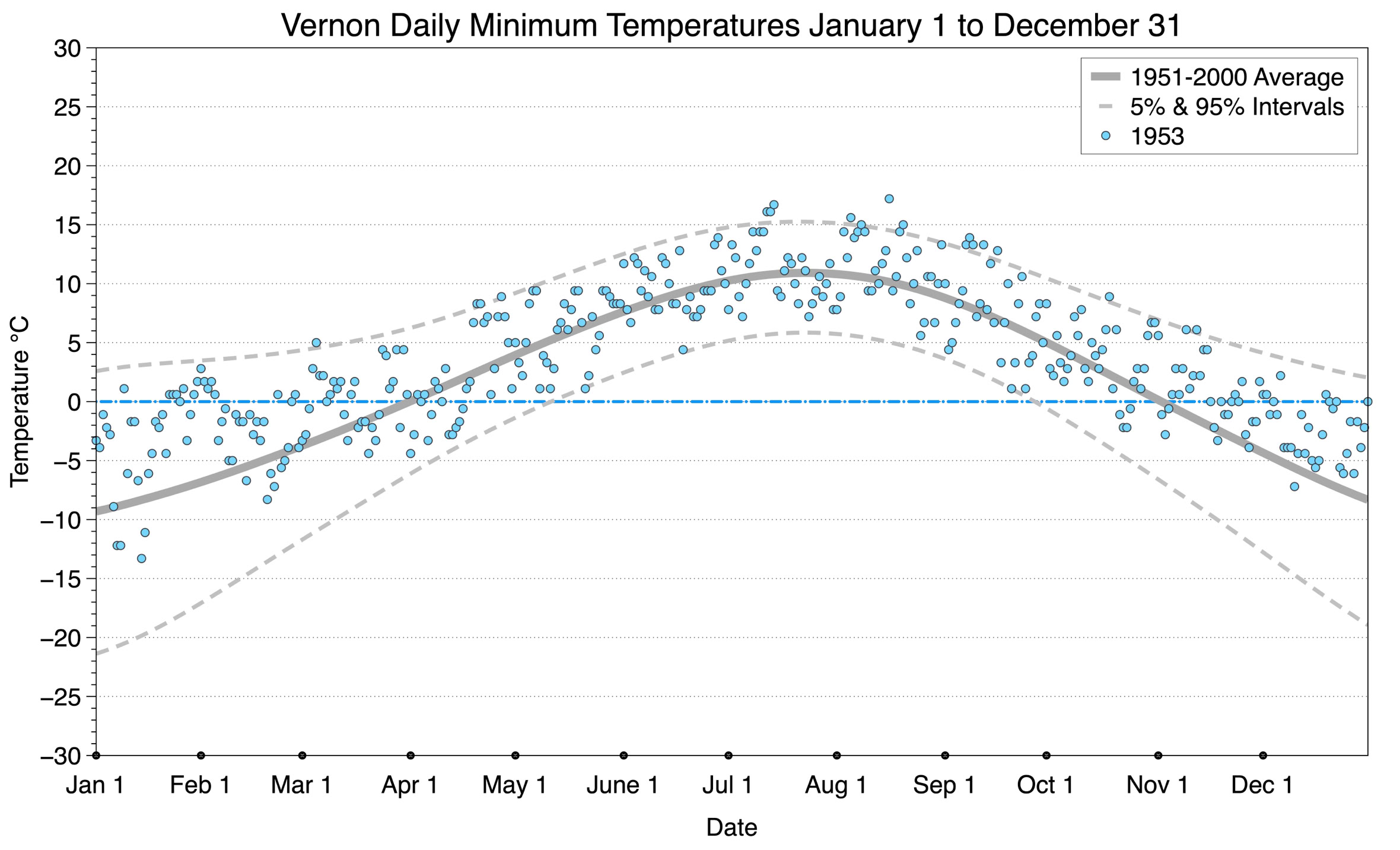 The graph below displays the day-to-day values of minimum daily temperature (blue dots) at Vernon for the year 1953. On this graph, the dark grey thick center line is the average daily temperature calculated from 50 years of data from 1951 to 2000. The dotted light grey lines are the 5% and 95% probability intervals - about 90% of the data from 1951 to 2000 fell within these boundaries. Daily temperatures can be considered as extreme cold or extreme hot events if they that fall outside the 5% or 95% probability intervals, respectively.