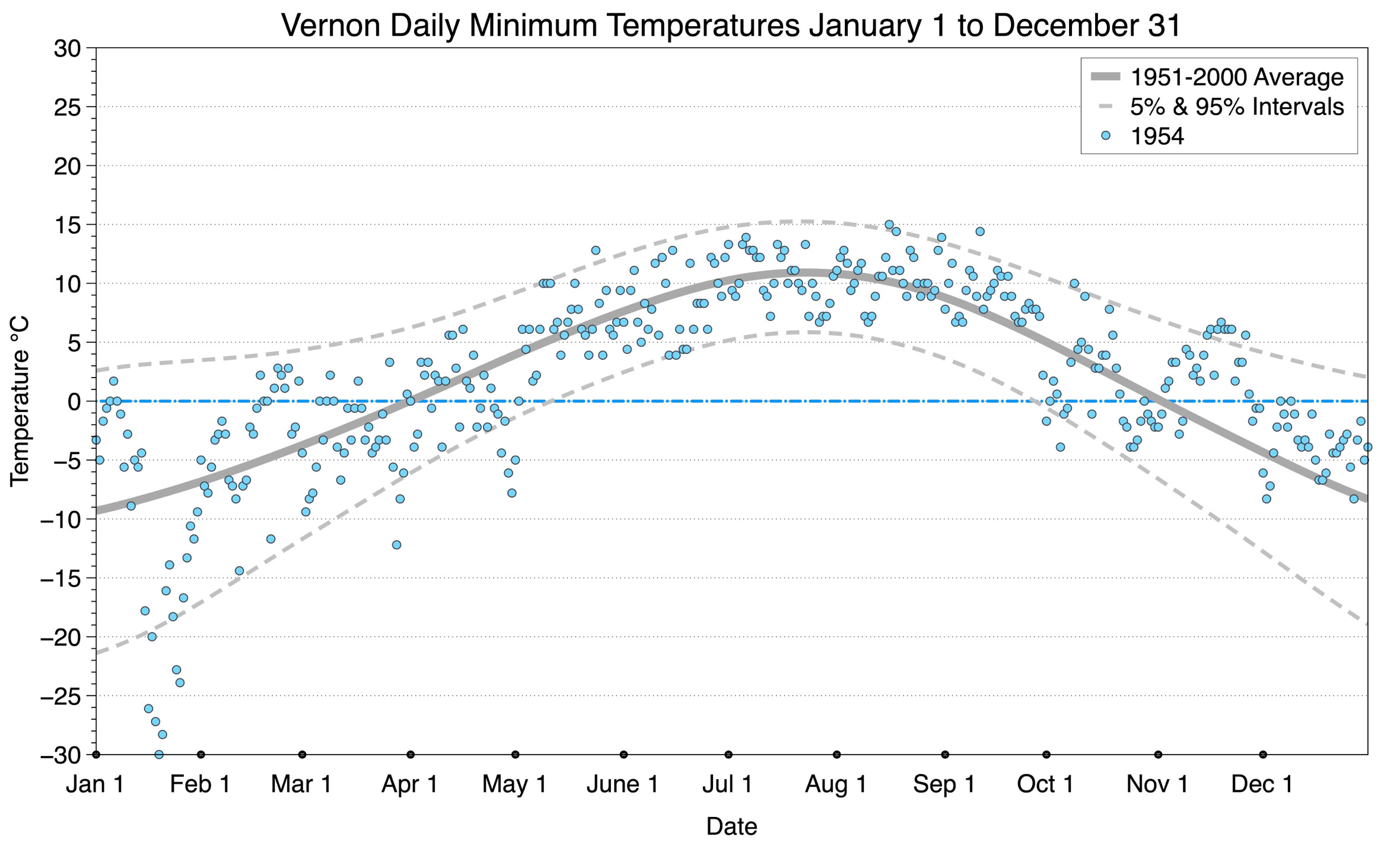 The graph below displays the day-to-day values of minimum daily temperature (blue dots) at Vernon for the year 1954. On this graph, the dark grey thick center line is the average daily temperature calculated from 50 years of data from 1951 to 2000. The dotted light grey lines are the 5% and 95% probability intervals - about 90% of the data from 1951 to 2000 fell within these boundaries. Daily temperatures can be considered as extreme cold or extreme hot events if they that fall outside the 5% or 95% probability intervals, respectively.