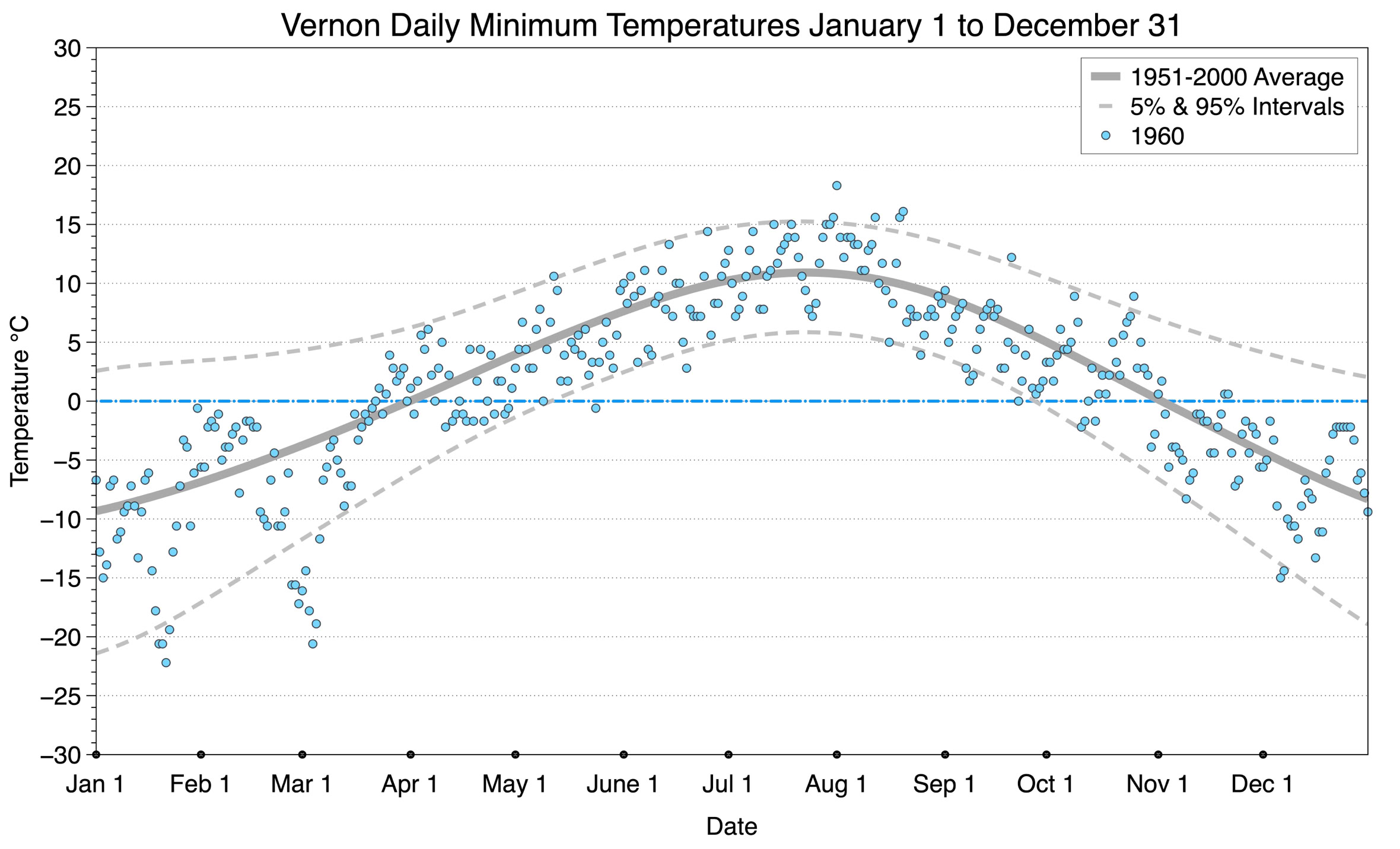 The graph below displays the day-to-day values of minimum daily temperature (blue dots) at Vernon for the year 1960. On this graph, the dark grey thick center line is the average daily temperature calculated from 50 years of data from 1951 to 2000. The dotted light grey lines are the 5% and 95% probability intervals - about 90% of the data from 1951 to 2000 fell within these boundaries. Daily temperatures can be considered as extreme cold or extreme hot events if they that fall outside the 5% or 95% probability intervals, respectively.