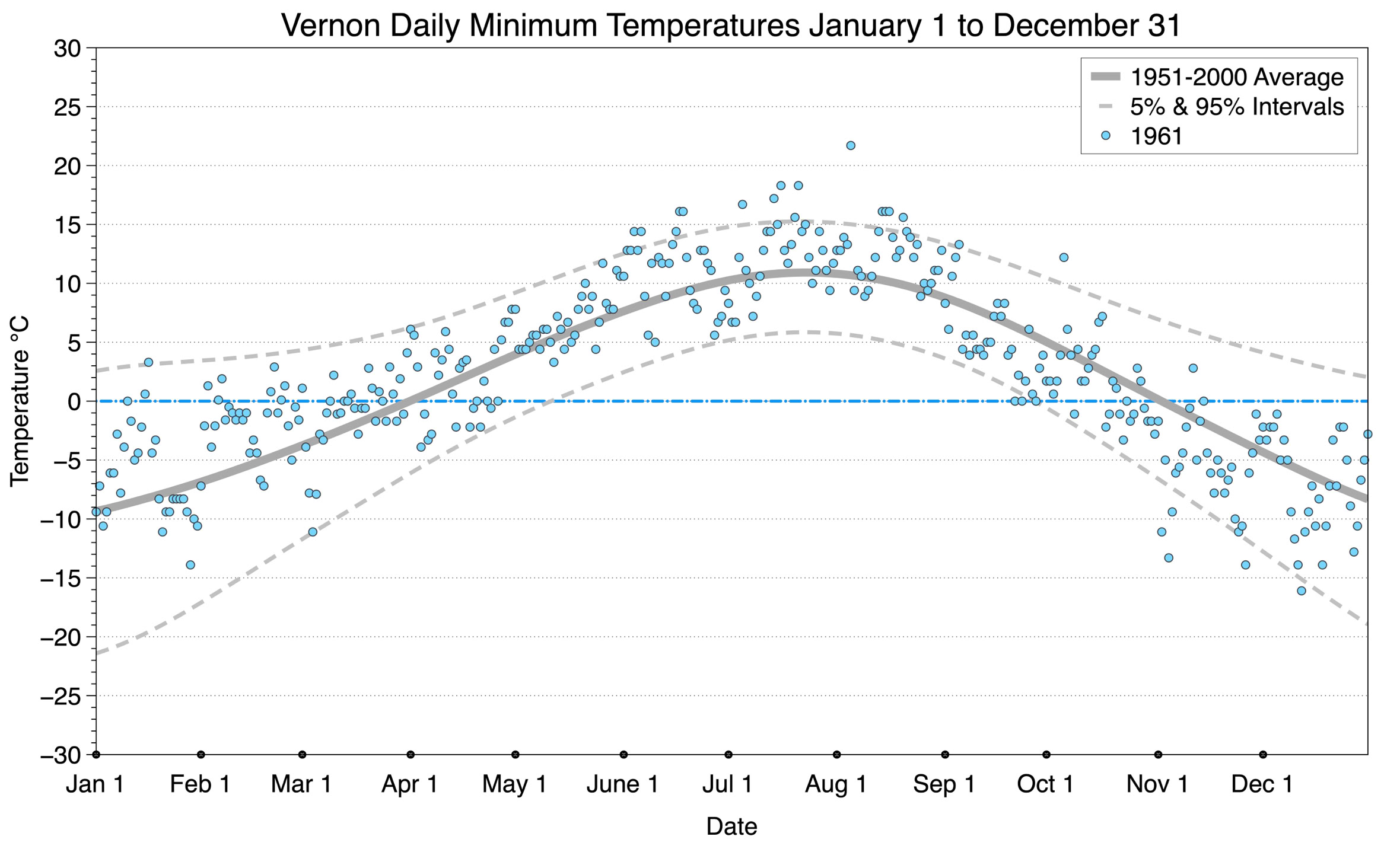 The graph below displays the day-to-day values of minimum daily temperature (blue dots) at Vernon for the year 1961. On this graph, the dark grey thick center line is the average daily temperature calculated from 50 years of data from 1951 to 2000. The dotted light grey lines are the 5% and 95% probability intervals - about 90% of the data from 1951 to 2000 fell within these boundaries. Daily temperatures can be considered as extreme cold or extreme hot events if they that fall outside the 5% or 95% probability intervals, respectively.