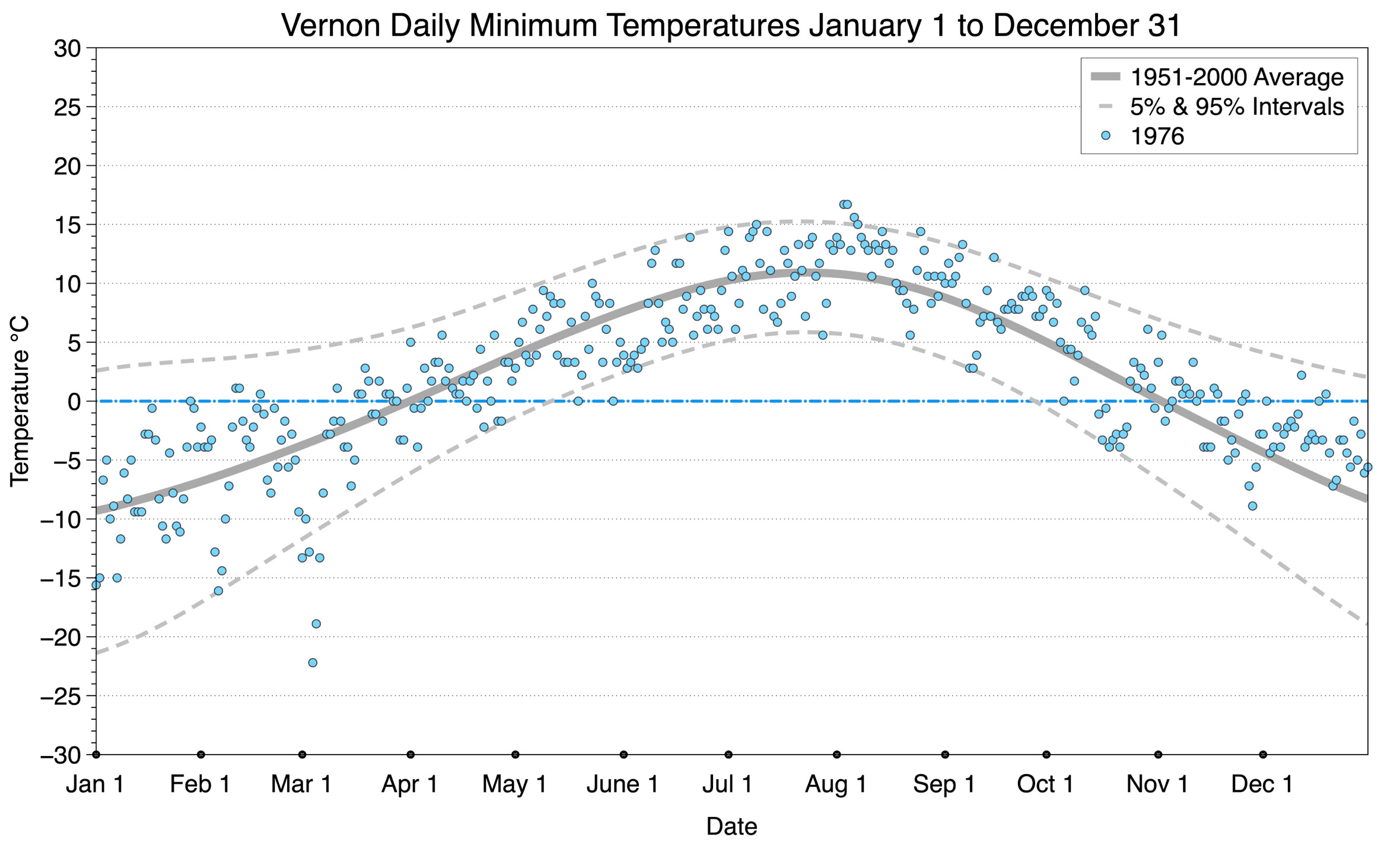 The graph below displays the day-to-day values of minimum daily temperature (blue dots) at Vernon for the year 1976. On this graph, the dark grey thick center line is the average daily temperature calculated from 50 years of data from 1951 to 2000. The dotted light grey lines are the 5% and 95% probability intervals - about 90% of the data from 1951 to 2000 fell within these boundaries. Daily temperatures can be considered as extreme cold or extreme hot events if they that fall outside the 5% or 95% probability intervals, respectively.