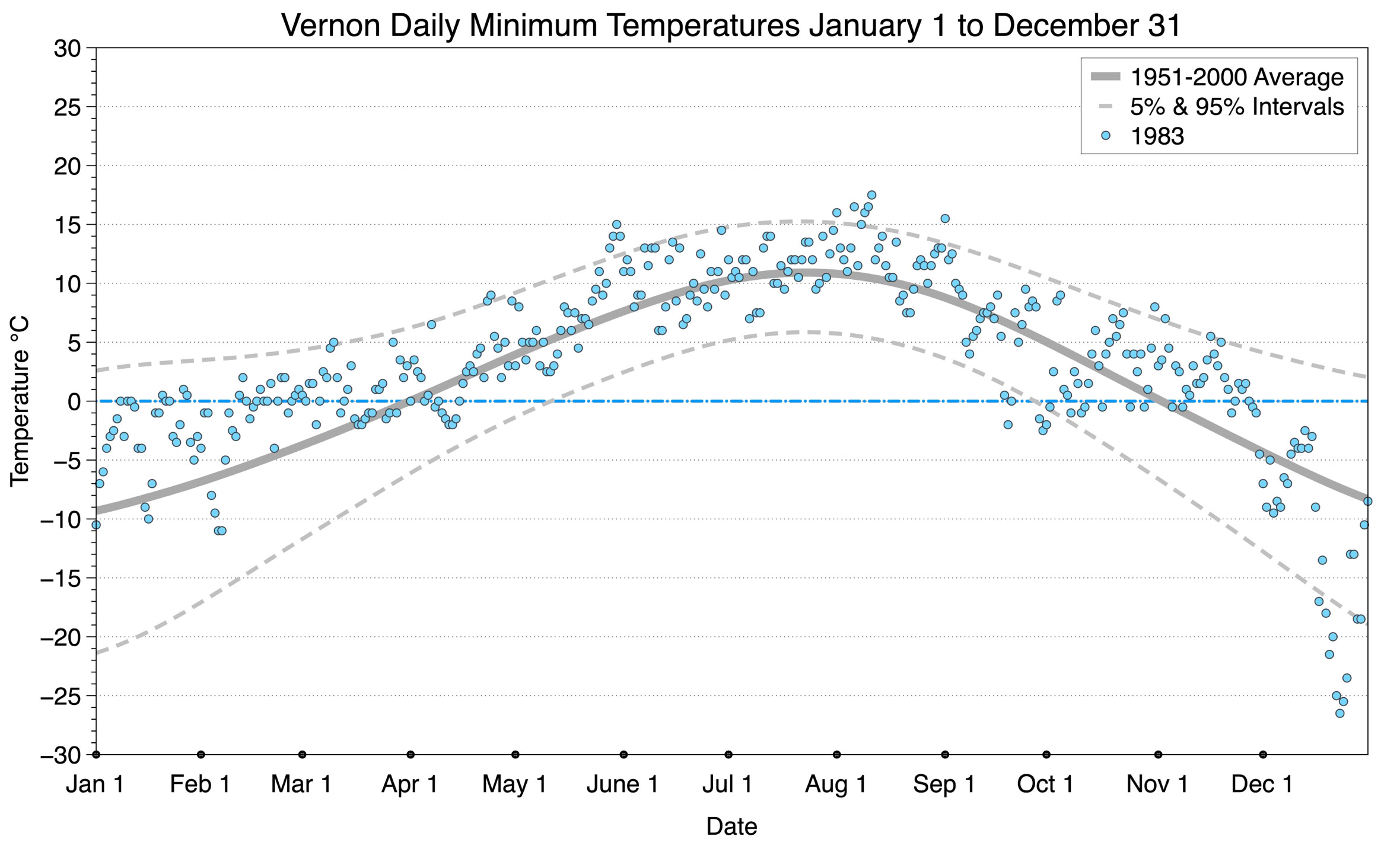 The graph below displays the day-to-day values of minimum daily temperature (blue dots) at Vernon for the year 1983. On this graph, the dark grey thick center line is the average daily temperature calculated from 50 years of data from 1951 to 2000. The dotted light grey lines are the 5% and 95% probability intervals - about 90% of the data from 1951 to 2000 fell within these boundaries. Daily temperatures can be considered as extreme cold or extreme hot events if they that fall outside the 5% or 95% probability intervals, respectively.