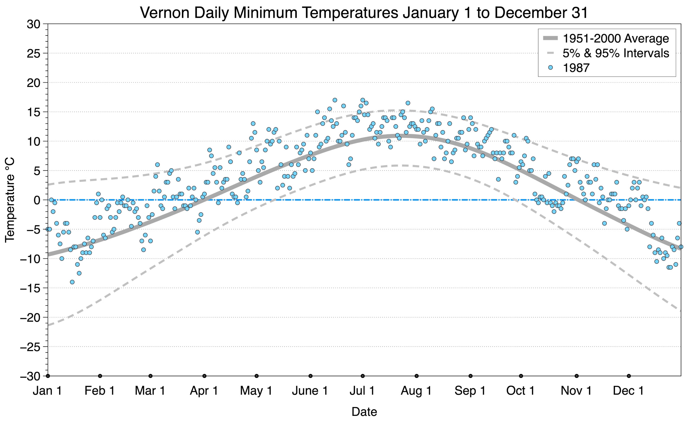 The graph below displays the day-to-day values of minimum daily temperature (blue dots) at Vernon for the year 1987. On this graph, the dark grey thick center line is the average daily temperature calculated from 50 years of data from 1951 to 2000. The dotted light grey lines are the 5% and 95% probability intervals - about 90% of the data from 1951 to 2000 fell within these boundaries. Daily temperatures can be considered as extreme cold or extreme hot events if they that fall outside the 5% or 95% probability intervals, respectively.