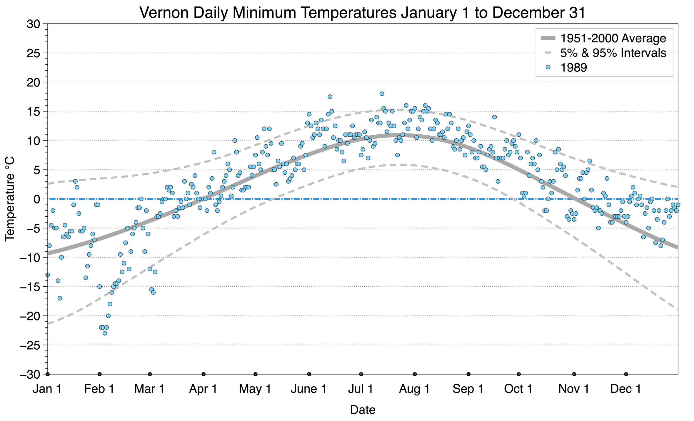 The graph below displays the day-to-day values of minimum daily temperature (blue dots) at Vernon for the year 1989. On this graph, the dark grey thick center line is the average daily temperature calculated from 50 years of data from 1951 to 2000. The dotted light grey lines are the 5% and 95% probability intervals - about 90% of the data from 1951 to 2000 fell within these boundaries. Daily temperatures can be considered as extreme cold or extreme hot events if they that fall outside the 5% or 95% probability intervals, respectively.