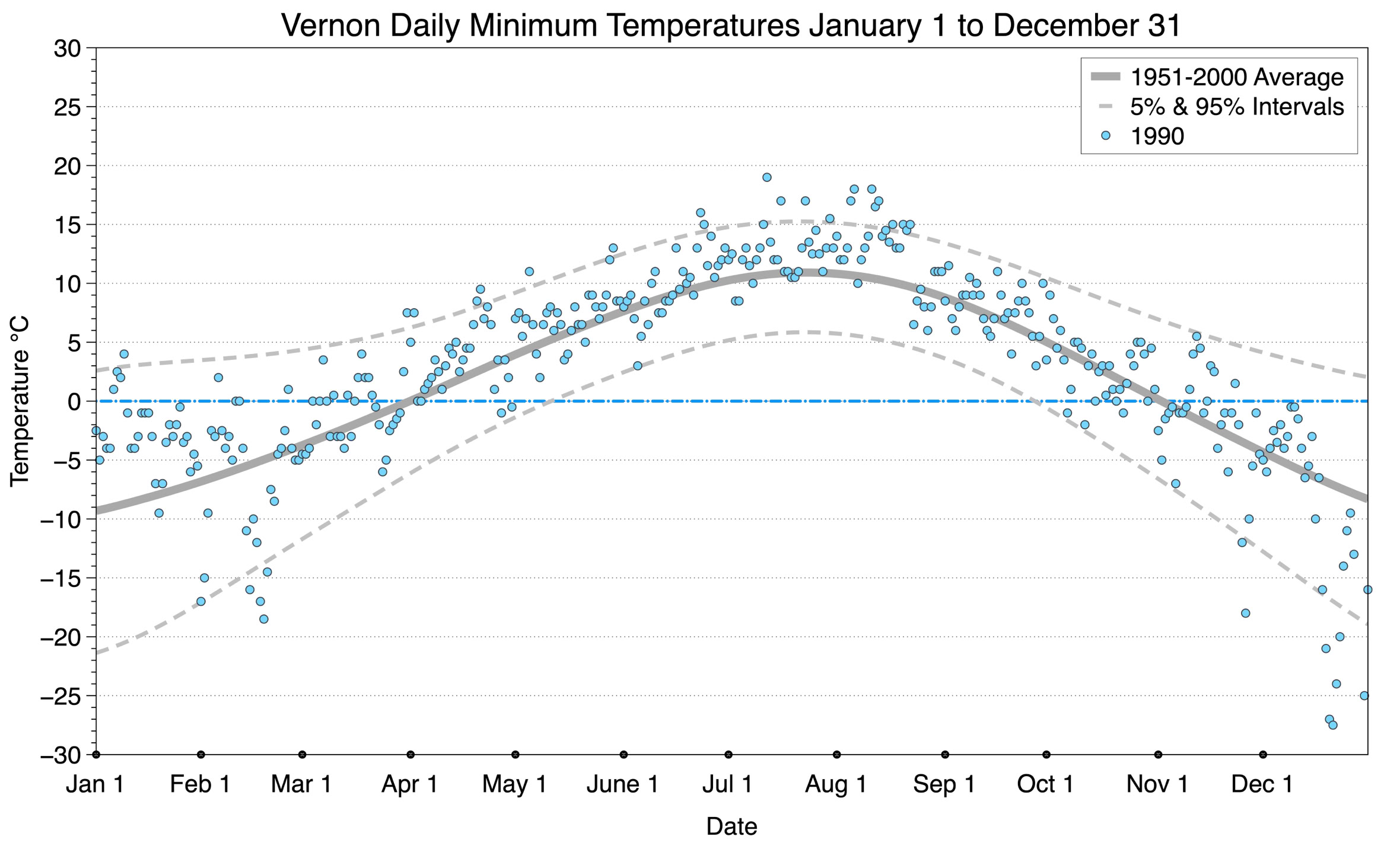 The graph below displays the day-to-day values of minimum daily temperature (blue dots) at Vernon for the year 1990. On this graph, the dark grey thick center line is the average daily temperature calculated from 50 years of data from 1951 to 2000. The dotted light grey lines are the 5% and 95% probability intervals - about 90% of the data from 1951 to 2000 fell within these boundaries. Daily temperatures can be considered as extreme cold or extreme hot events if they that fall outside the 5% or 95% probability intervals, respectively.