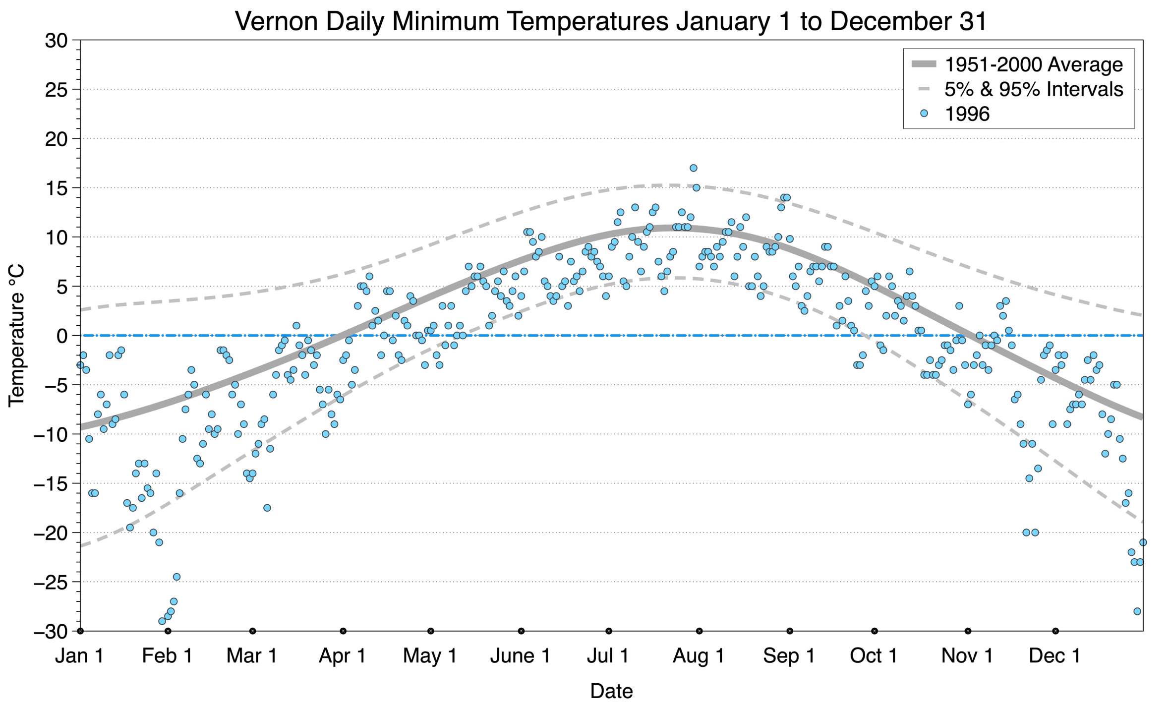 The graph below displays the day-to-day values of minimum daily temperature (blue dots) at Vernon for the year 1996. On this graph, the dark grey thick center line is the average daily temperature calculated from 50 years of data from 1951 to 2000. The dotted light grey lines are the 5% and 95% probability intervals - about 90% of the data from 1951 to 2000 fell within these boundaries. Daily temperatures can be considered as extreme cold or extreme hot events if they that fall outside the 5% or 95% probability intervals, respectively.
