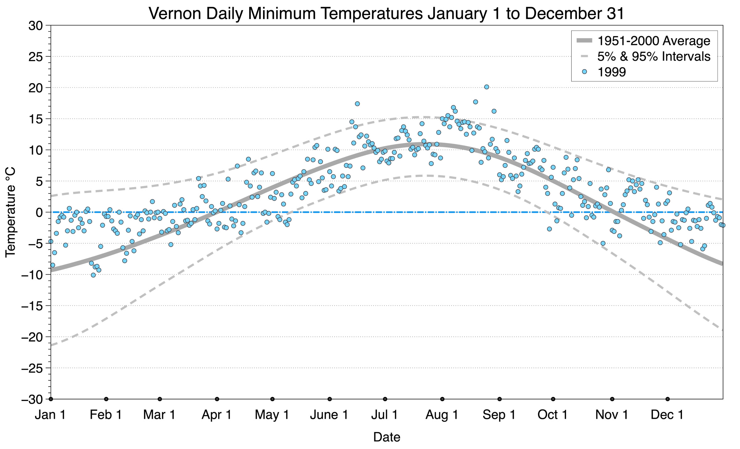 The graph below displays the day-to-day values of minimum daily temperature (blue dots) at Vernon for the year 1999. On this graph, the dark grey thick center line is the average daily temperature calculated from 50 years of data from 1951 to 2000. The dotted light grey lines are the 5% and 95% probability intervals - about 90% of the data from 1951 to 2000 fell within these boundaries. Daily temperatures can be considered as extreme cold or extreme hot events if they that fall outside the 5% or 95% probability intervals, respectively.