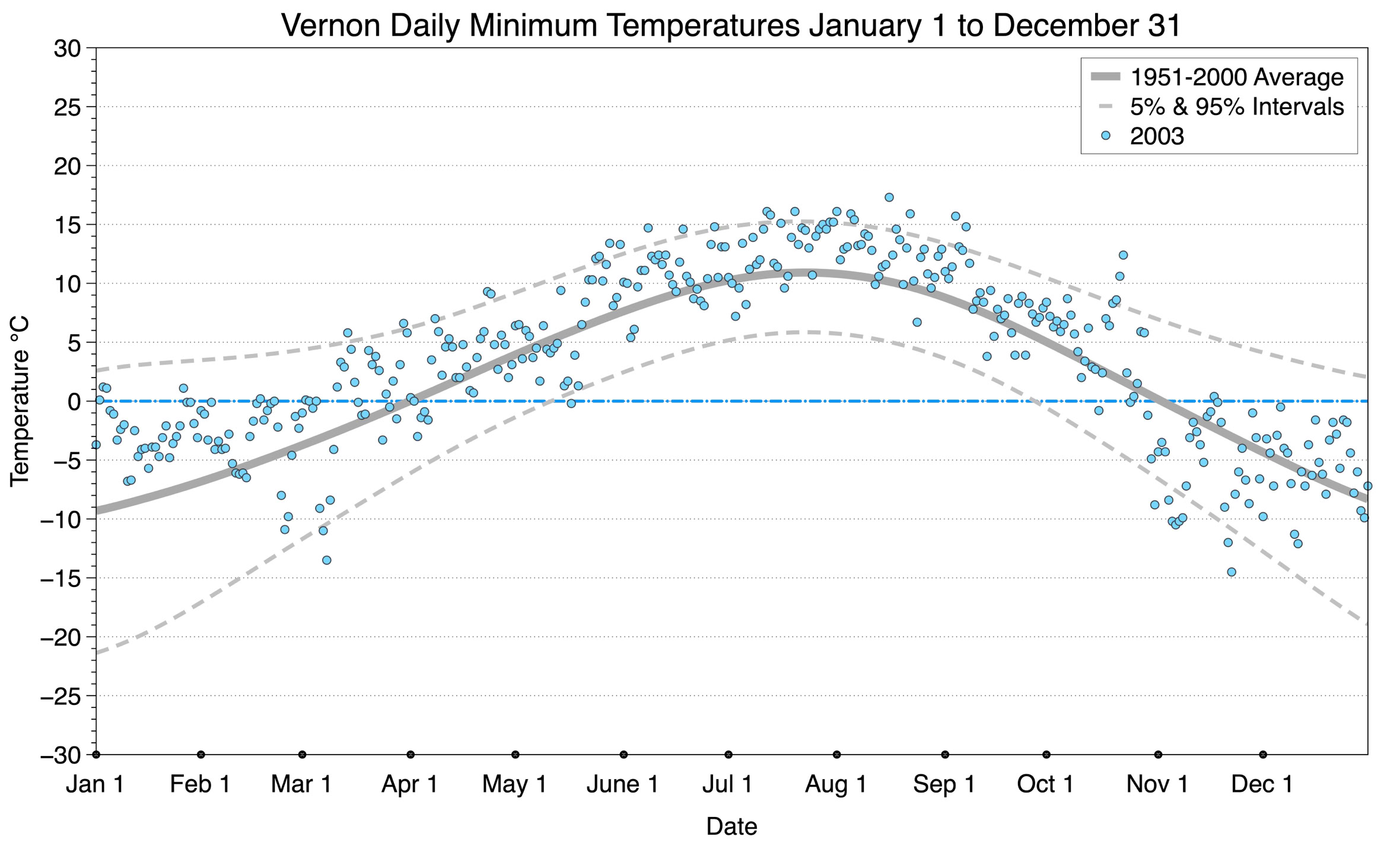 The graph below displays the day-to-day values of minimum daily temperature (blue dots) at Vernon for the year 2003. On this graph, the dark grey thick center line is the average daily temperature calculated from 50 years of data from 1951 to 2000. The dotted light grey lines are the 5% and 95% probability intervals - about 90% of the data from 1951 to 2000 fell within these boundaries. Daily temperatures can be considered as extreme cold or extreme hot events if they that fall outside the 5% or 95% probability intervals, respectively.
