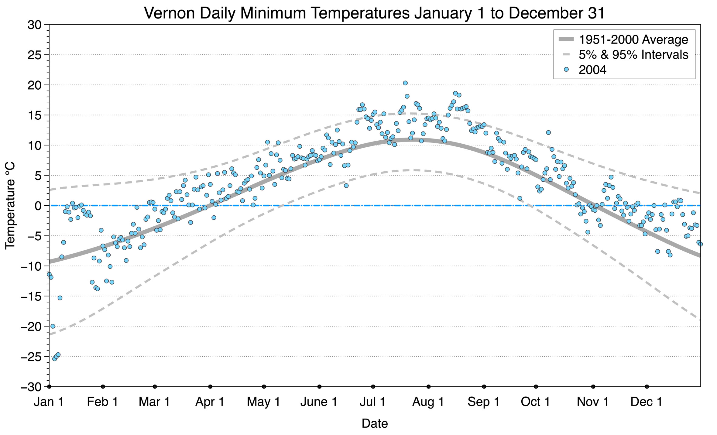 The graph below displays the day-to-day values of minimum daily temperature (blue dots) at Vernon for the year 2004. On this graph, the dark grey thick center line is the average daily temperature calculated from 50 years of data from 1951 to 2000. The dotted light grey lines are the 5% and 95% probability intervals - about 90% of the data from 1951 to 2000 fell within these boundaries. Daily temperatures can be considered as extreme cold or extreme hot events if they that fall outside the 5% or 95% probability intervals, respectively.