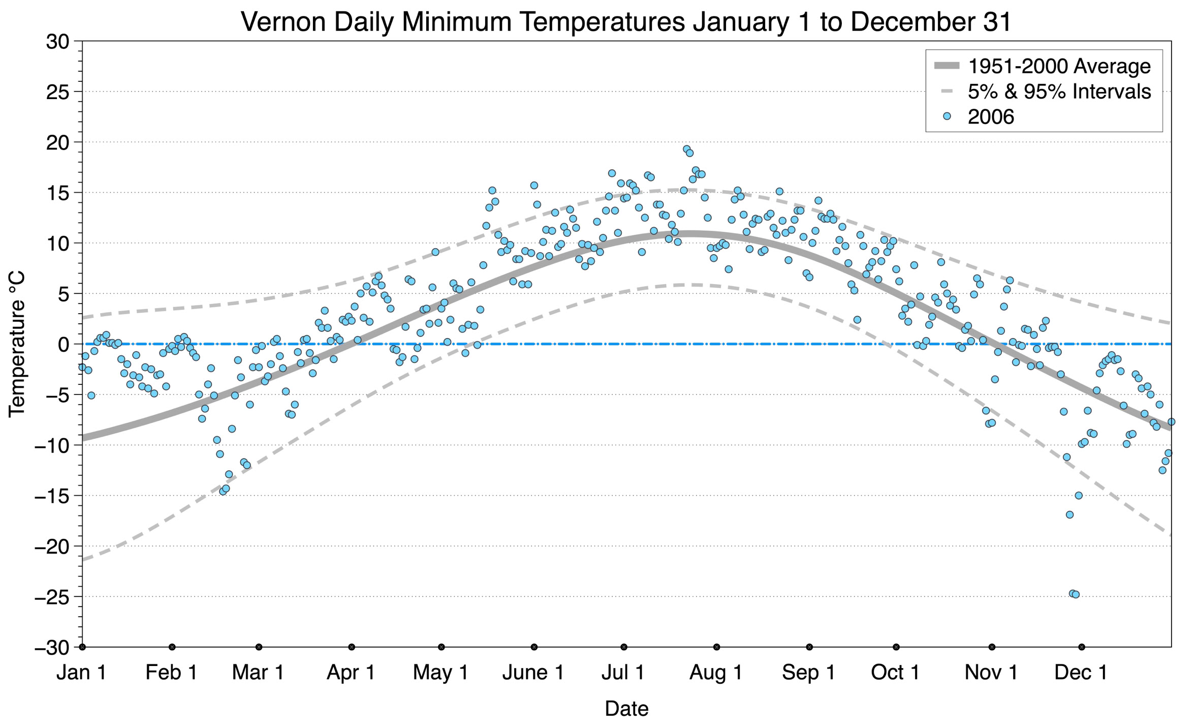 The graph below displays the day-to-day values of minimum daily temperature (blue dots) at Vernon for the year 2006. On this graph, the dark grey thick center line is the average daily temperature calculated from 50 years of data from 1951 to 2000. The dotted light grey lines are the 5% and 95% probability intervals - about 90% of the data from 1951 to 2000 fell within these boundaries. Daily temperatures can be considered as extreme cold or extreme hot events if they that fall outside the 5% or 95% probability intervals, respectively.