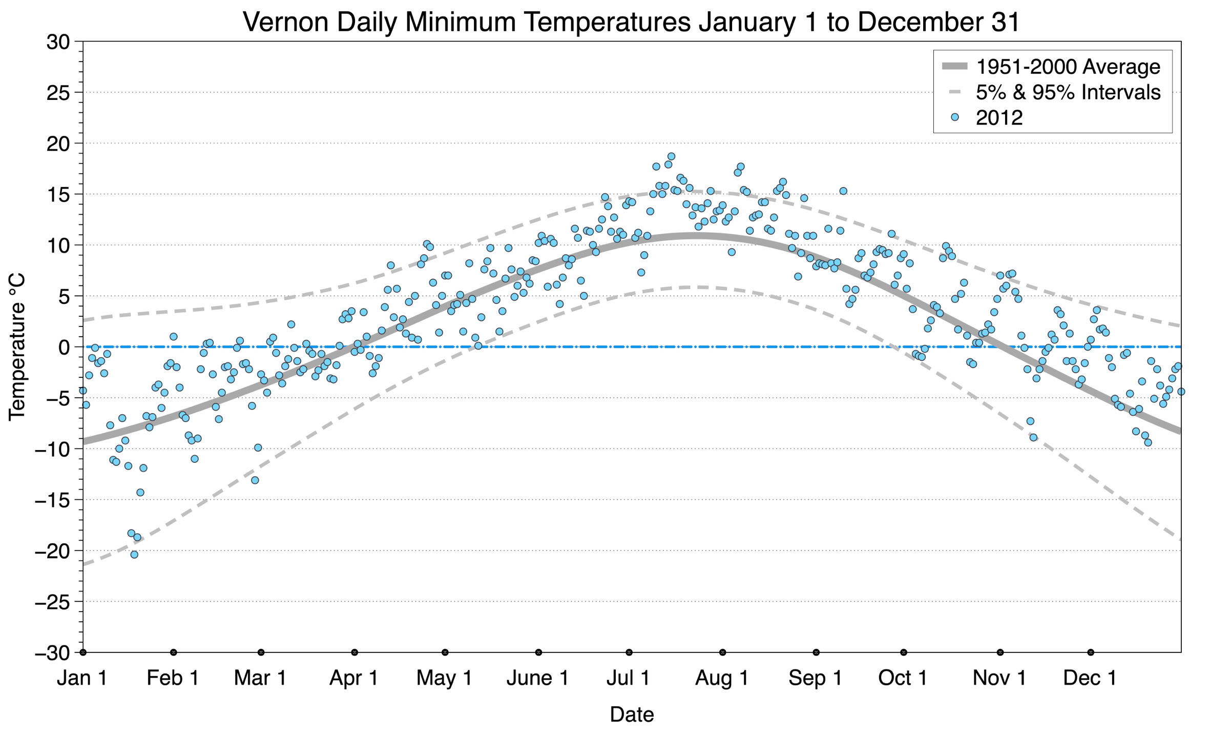 The graph below displays the day-to-day values of minimum daily temperature (blue dots) at Vernon for the year 2012. On this graph, the dark grey thick center line is the average daily temperature calculated from 50 years of data from 1951 to 2000. The dotted light grey lines are the 5% and 95% probability intervals - about 90% of the data from 1951 to 2000 fell within these boundaries. Daily temperatures can be considered as extreme cold or extreme hot events if they that fall outside the 5% or 95% probability intervals, respectively.