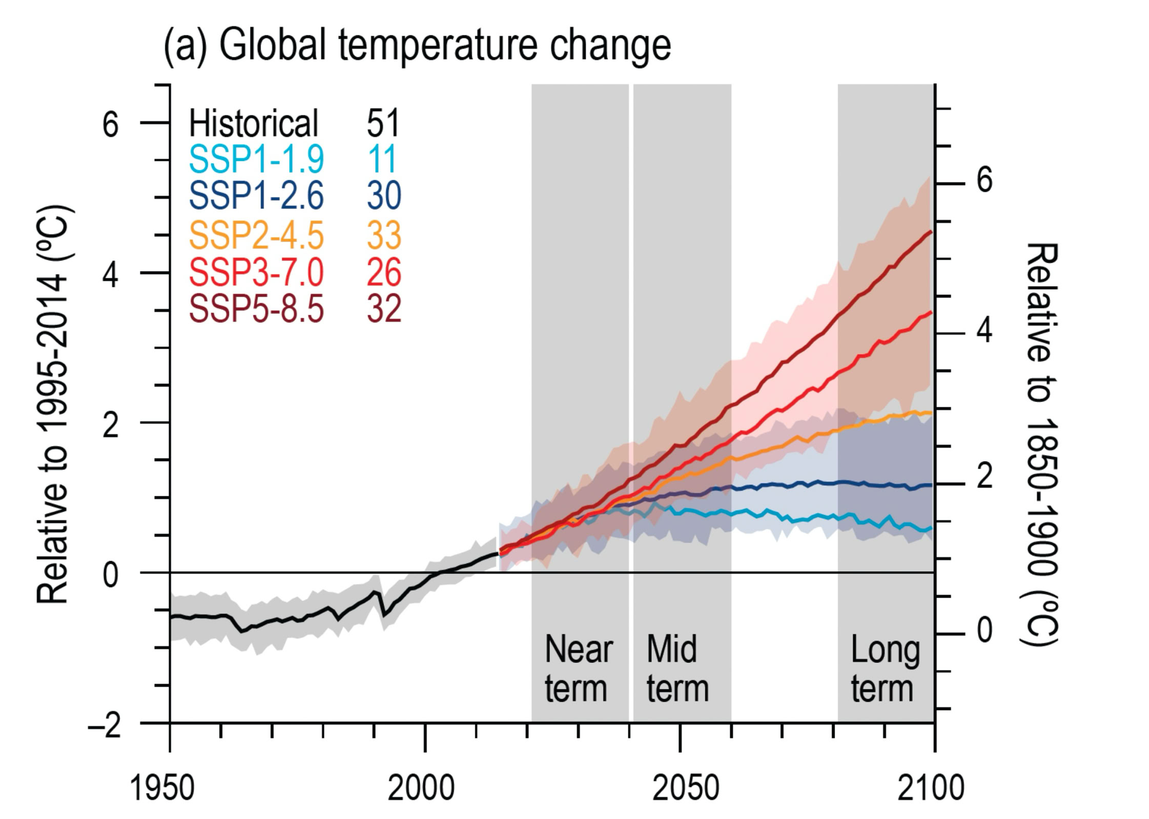 Figure 2 Global surface air temperature changes are shown relative to the 1995–2014 average on the left axis, and relative to the 1850–1900 baseline on the right axis, using an offset of 0.82 °C that reflects the multi‑model mean and aligns closely with observational estimates. The figure includes five emissions pathways—SSP1‑1.9, SSP1‑2.6, SSP2‑4.5, SSP3‑7.0, and SSP5‑8.5. Shaded bands around the SSP1‑2.6 and SSP3‑7.0 trajectories indicate the 5–95% confidence ranges. Image Source: IPCC, 2021. Figure 4.2.