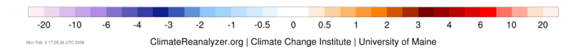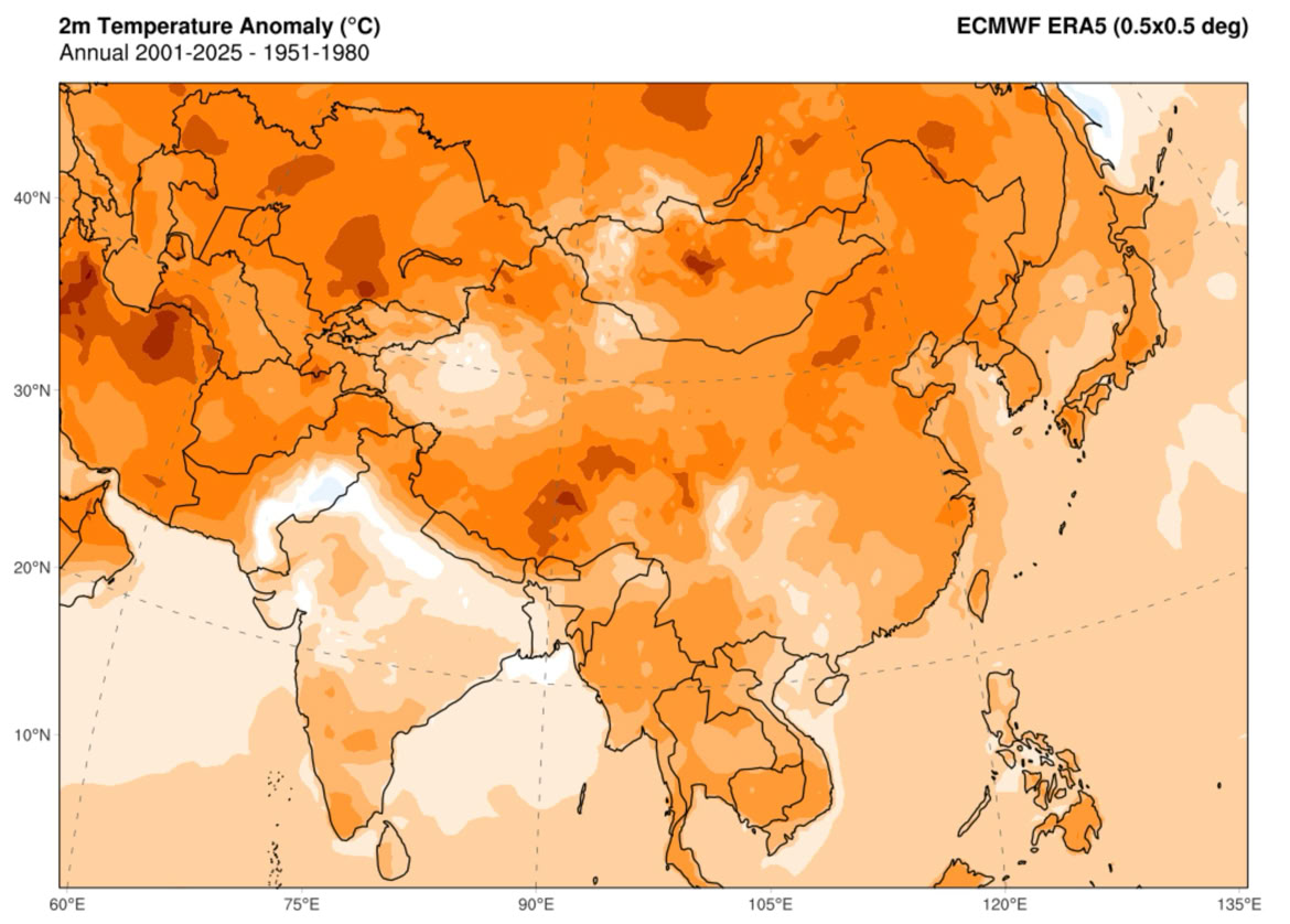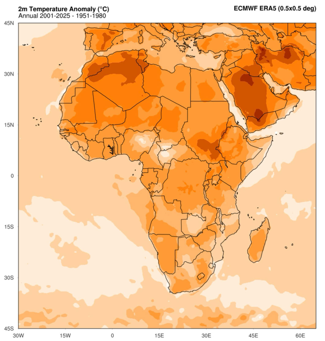 Figure 2 Regional changes in surface annual mean temperature (°C) for the first quarter of the 21st century (2001-2025) relative to the 1951 to 1980 average. Regions shown are Asia, North America, Europe, South America, and Africa. Image Creation and Source: Climate ReAnalyzer - Monthly Reanalysis Maps.